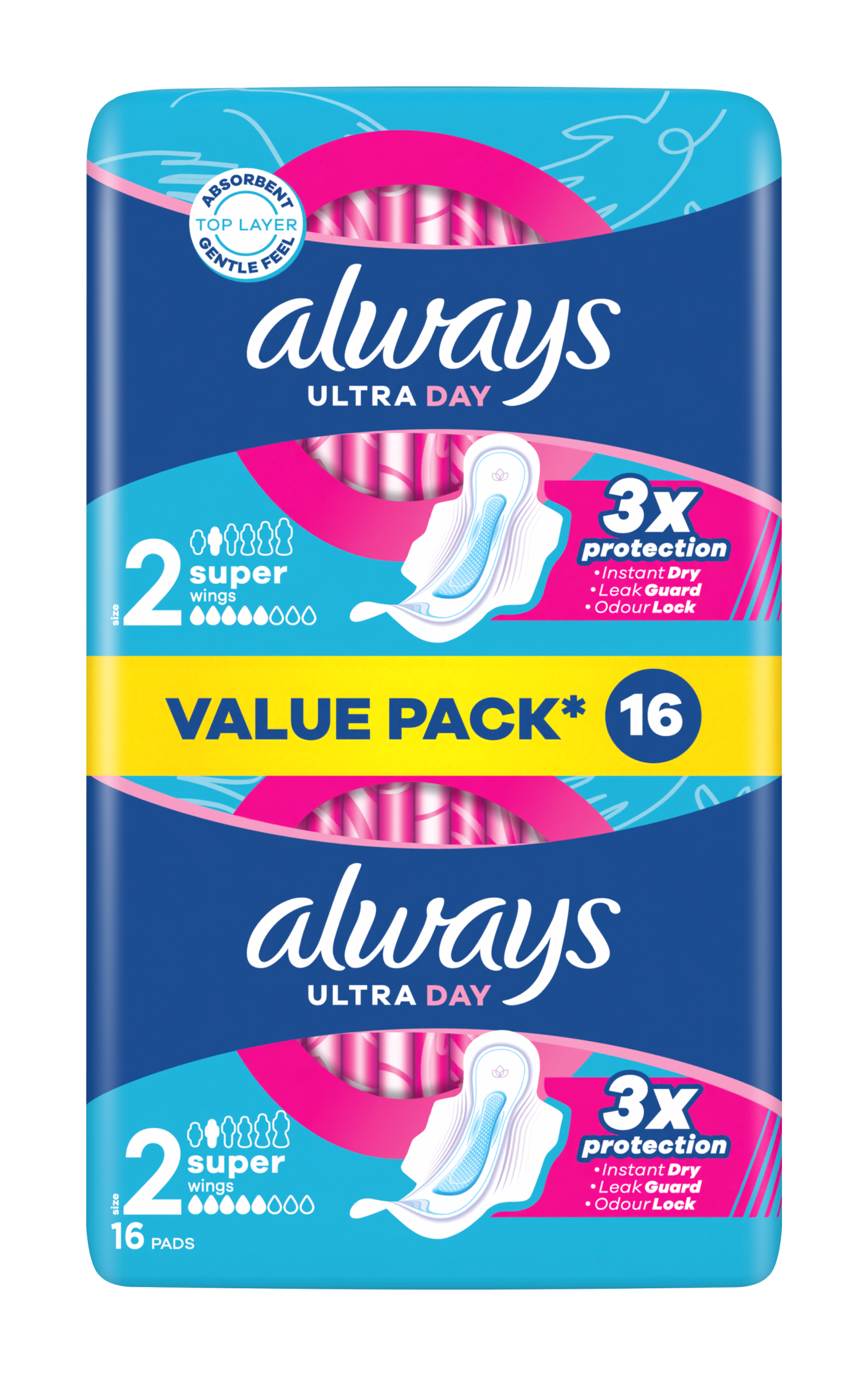 Nespokojujte se s méně než 3násobnou ochranou s hygienickými vložkami Always Ultra Day Super (velikost 2) s křidélky. Vložky Always s absorpční a hebkou povrchovou vrstvou absorbují díky technologii InstantDry tekutinu během několika sekund a díky technologiím LeakGuard a OdorLock zabraňují protečení a zápachu. Jejich jedinečná křidélka ComfortLock jsou navržena tak, aby se skvěle přizpůsobila jakémukoliv typu spodního prádla. Pro mimořádnou ochranu během noci vyzkoušejte vložky Always Night různých velikostí. Vložky Always jsou dermatologicky schváleny organizací Skin Health Alliance.