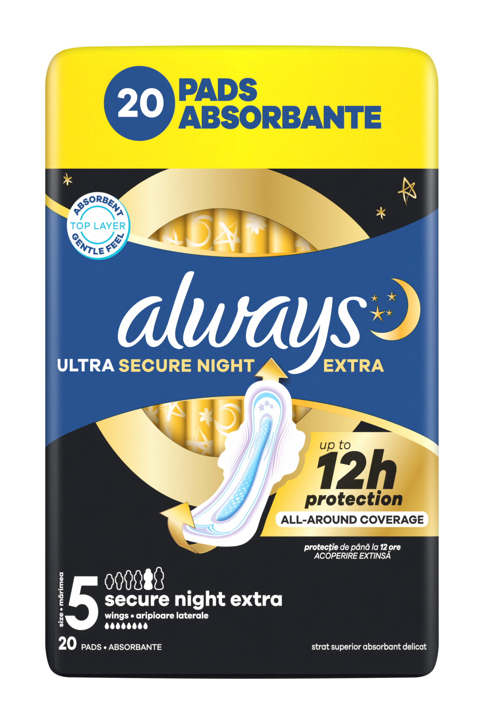 Díky až 12hodinové ochraně nemusíte dělat kompromisy a spokojovat se s přerušovaným spánkem: Hygienické vložky Always Ultra Secure Night Extra (velikost 5) s křidélky a absorpční hebkou povrchovou vrstvou jsou vybaveny 3 ochrannými prvky, takže se nemusíte v noci budit a kontrolovat, jestli vložka neprotéká nebo nepotřebuje vyměnit. O 9 % větší přední část a o 85 % větší zadní část (v porovnání s Always Ultra Normal velikosti 1) zajišťují spolu s technologií LeakGuard kompletní ochranu a předchází tak protečení během noci. Vložky Always Ultra jsou dermatologicky schváleny organizací Skin Health Alliance.