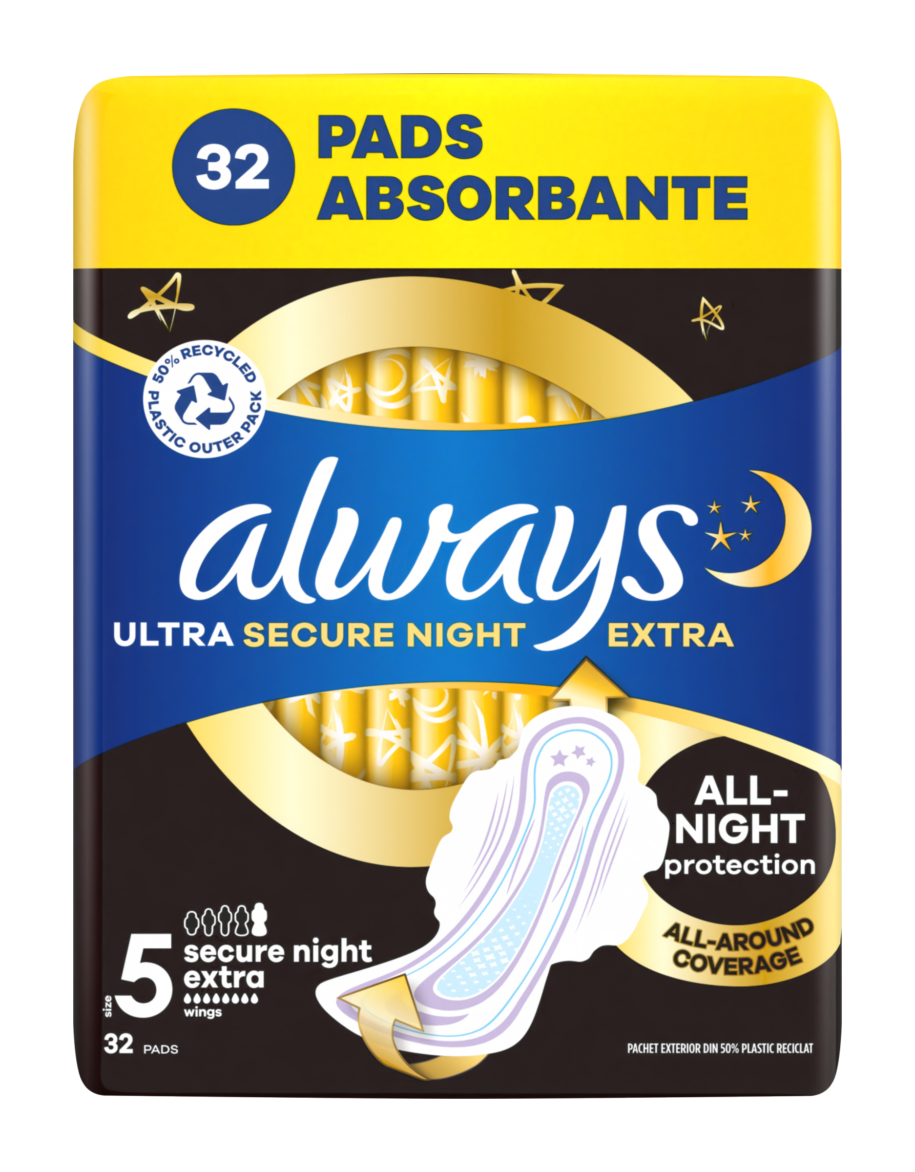 S hygienickými vložkami ALWAYS Ultra Secure Night Extra (velikost 5) s křidélky nemusíte dělat kompromisy a smiřovat se s přerušovaným spánkem. Mají 3 ochranné prvky, takže se nemusíte v noci probouzet a kontrolovat, jestli vložka neprotéká nebo nepotřebuje vyměnit. O 9 % větší přední část a o 85 % větší zadní část* zajišťuje spolu s technologií LeakGuard kompletní ochranu, takže během noci zabraňuje protečení. Systém InstantDry absorbuje tekutinu během několika sekund a odvádí vlhkost od pokožky. Navíc obsahuje technologii OdourLock, která neutralizuje zápach, takže se můžete cítit čistě a svěží. Dopřejte si klidný spánek, Always Ultra s trojnásobnou ochranou se o vás postará. Dermatologicky schválila Aliance pro zdraví pokožky (Skin Health Alliance). Díky systému pro určení vhodné velikosti Always Moje Velikost si najdete tu nejlepší ochranu od ALWAYS podle intenzity své menstruace a velikosti spodních kalhotek.