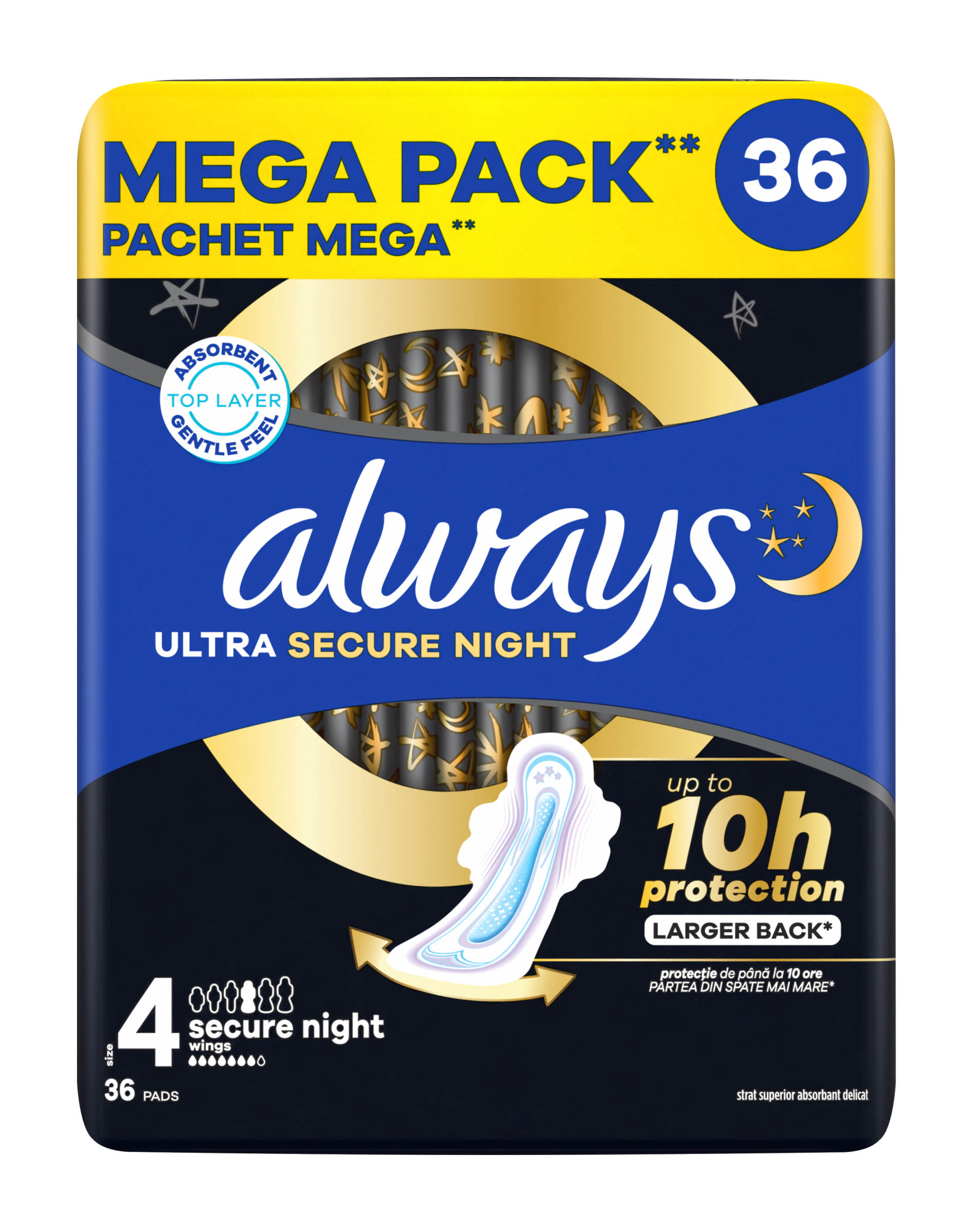 S hygienickými vložkami ALWAYS Ultra Secure Night (velikost 4) s křidélky nemusíte dělat kompromisy a smiřovat se s nekvalitním spánkem. Mají 3 ochranné prvky, takže se nemusíte v noci probouzet a kontrolovat, jestli vložka neprotéká nebo nepotřebuje vyměnit. O 60 % větší zadní část* spolu s technologií LeakGuard uzamyká tekutinu uvnitř, takže během noci pomáhá chránit před protečením. Systém InstantDry absorbuje tekutinu během několika sekund a odvádí vlhkost od pokožky. Navíc obsahuje technologii OdourLock, která neutralizuje zápach, takže se můžete cítit čistě a svěží. Dopřejte si klidný spánek, Always Ultra s trojnásobnou ochranou se o vás postará. Dermatologicky schválila Aliance pro zdraví pokožky (Skin Health Alliance). Pro extra ochranu vyzkoušejte hygienické vložky Always Ultra Secure Night Extra (velikost 5), které jsou nejlepší z řady Always pro použití v noci. Díky systému pro určení vhodné velikosti Always Moje Velikost si najdete tu nejlepší ochranu od ALWAYS podle intenzity své menstruace a velikosti spodních kalhotek.