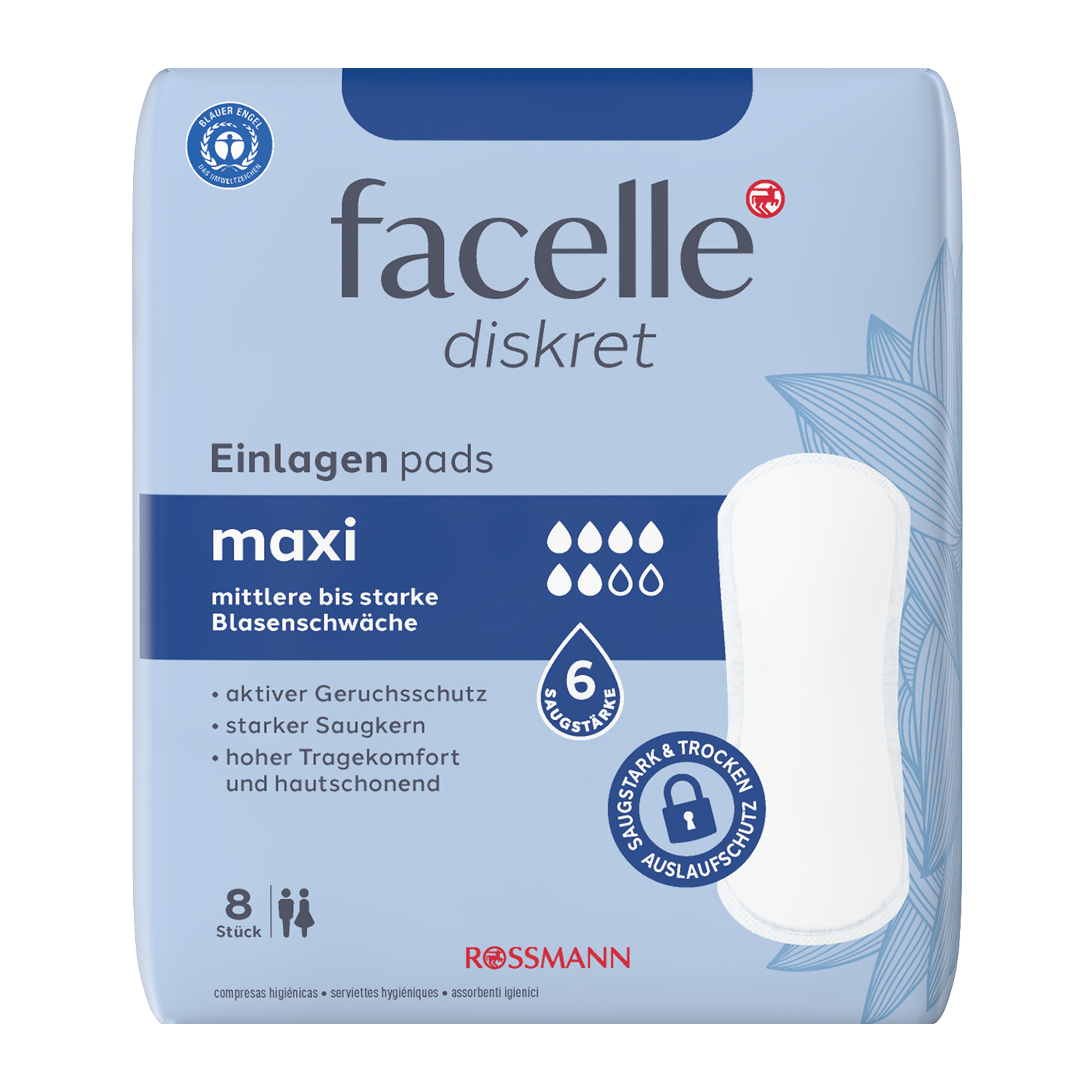 Rychlá absorpce tekutiny zajišťuje dlouhotrvající pocit sucha. Při střední až těžké slabosti močového měchýře. Maximální absorpční kapacita: 260 ml
