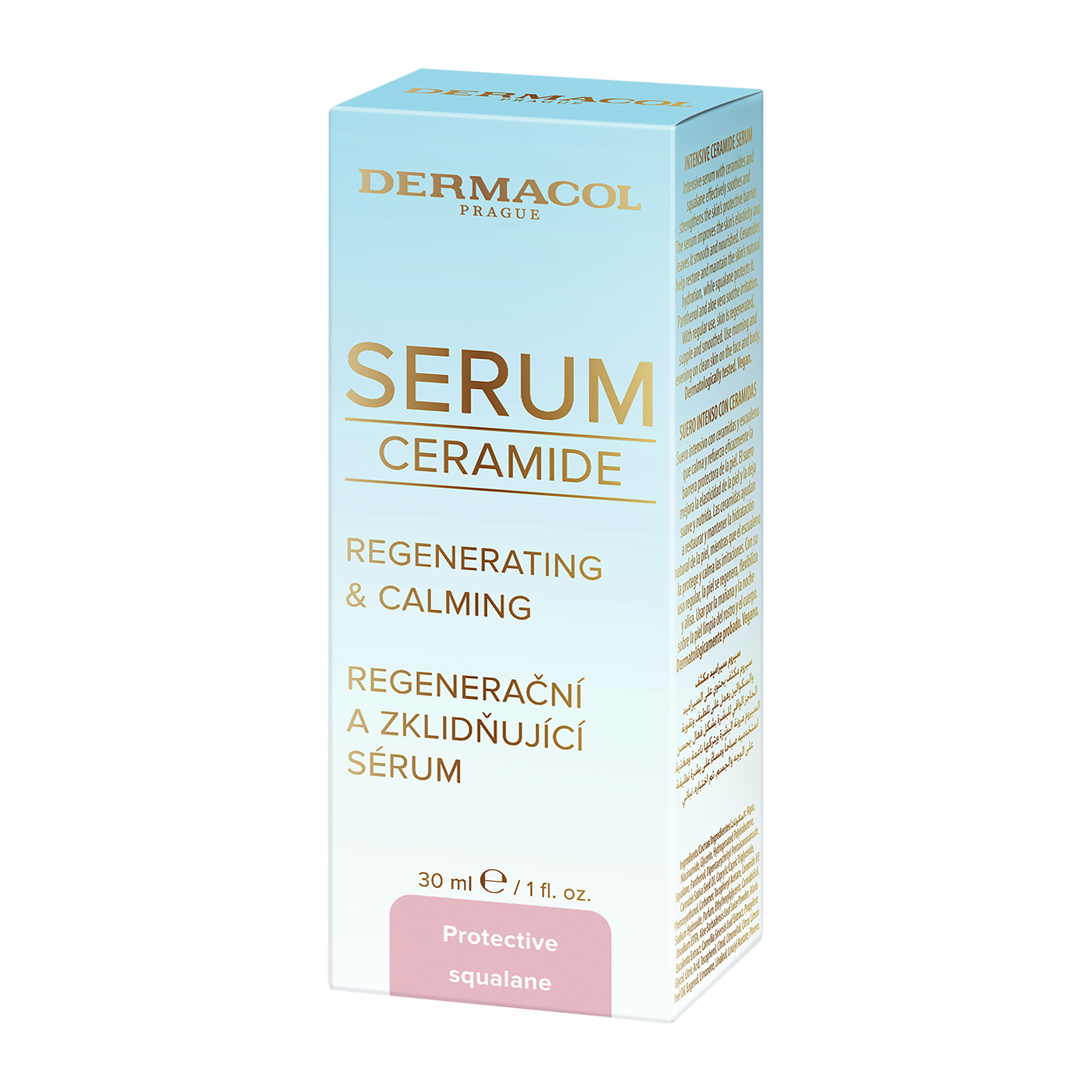 Intenzivní sérum s ceramidy a squalanem účinně zklidňuje a posiluje ochrannou bariéru pokožky. Sérum zlepšuje elasticitu pleti a zanechává ji hladkou a vyživenou. Ceramidy pomáhají obnovovat a udržovat přirozenou hydrataci pokožky, squalane pokožku chrání a zvláčňuje, panthenol a aloe vera zklidňuje podráždění, extrakt z mořských řas – kalpariane, niaciamide a vitamin E. Ceramidy jsou hojně využívané v kosmetice pro jejich skvělé antioxidační a antiage účinky. Jde o druh lipidů (tuků) s klíčovou rolí ve zdraví pokožky a jednu z nejdůležitějších částí pokožky. Uzamykají vlhkost v pokožce a chrání ji před poškozením, zlepšují pružnost a redukují drobné linky a vrásky. Pokožka je díky nim hebká, měkká a vypadá zdravěji.