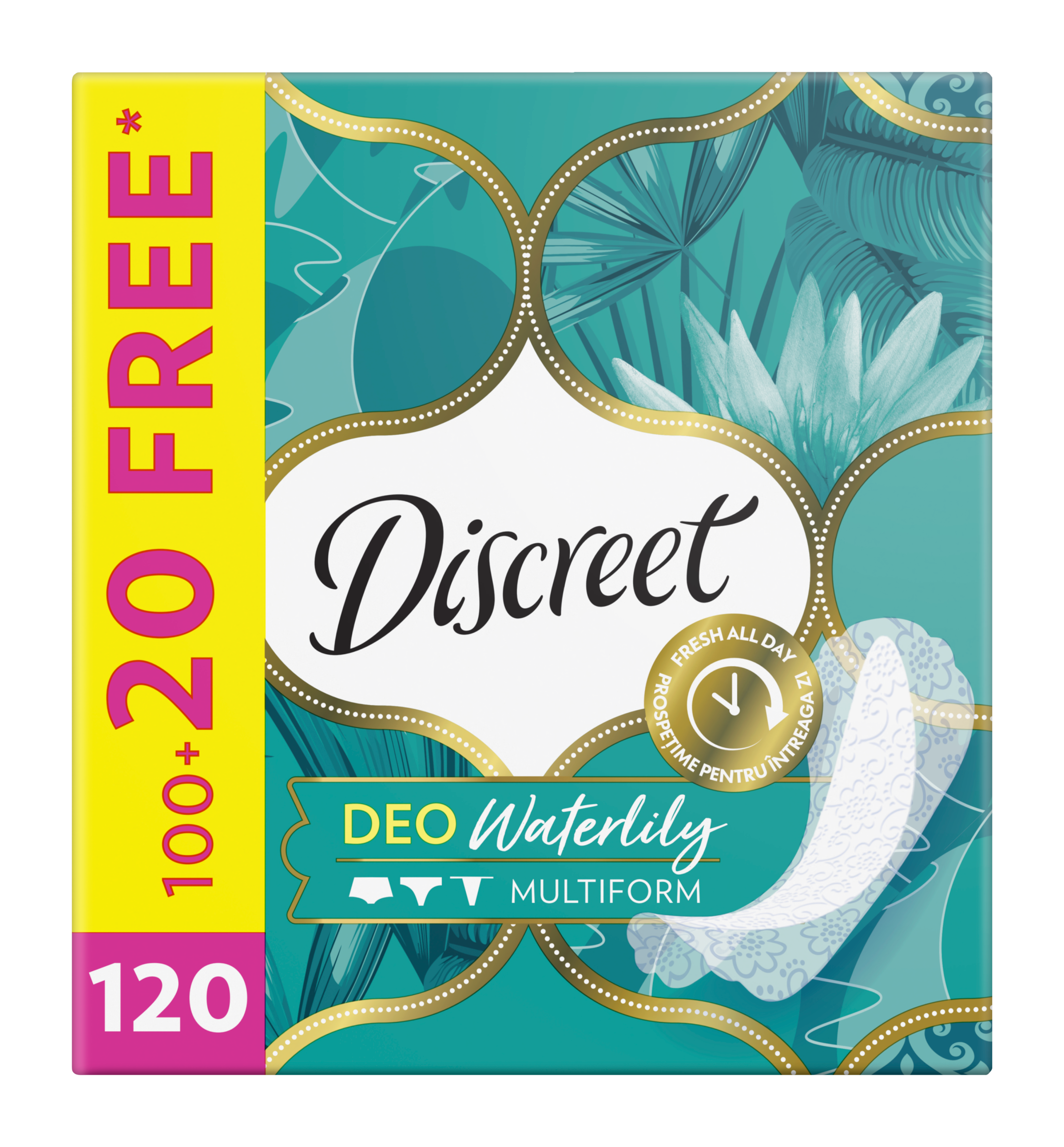 Intimky Discreet Multiform Waterlily vám pomohou cítit se svěží a krásná bez ohledu na váš styl! Tyto intimky umožňují pokožce v intimních partiích přirozeně dýchat a zajišťují tak až 12 hodin svěžesti a pohodlí. Jsou tak tenké, že je ani neucítíte. Navíc se díky svému flexibilnímu provedení přizpůsobí každému střihu spodních kalhotek. Charakteristická vůně leknínu je velmi svěží a ženská. Bez ohledu na to, co vám dnešek přinese, s těmito intimkami to zvládnete!