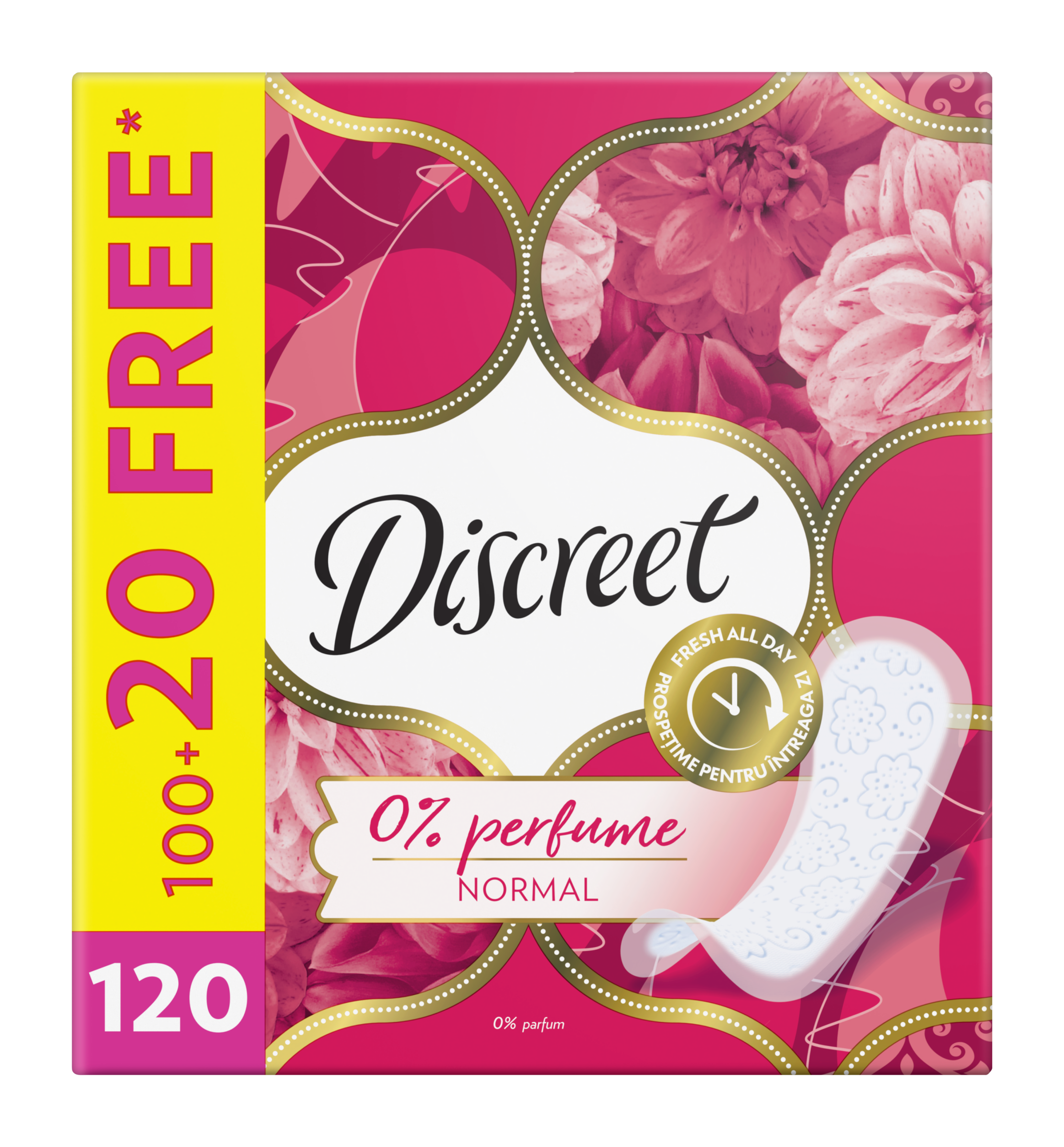 Neparfémované intimky Discreet Normal vám pomohou zůstat svěží a krásná po celý den. Intimky s lepicí vrstvou až k okrajům dokonale chrání spodní kalhotky. Design těchto intimek umožňuje pokožce v intimních partiích přirozeně dýchat a zajišťuje tak až 12 hodin svěžesti a pohodlí. Jsou tak tenké, že je ani neucítíte. Tato varianta obsahuje 0 % parfemace. Bez ohledu na to, co vám dnešek přinese, s těmito intimkami to zvládnete!