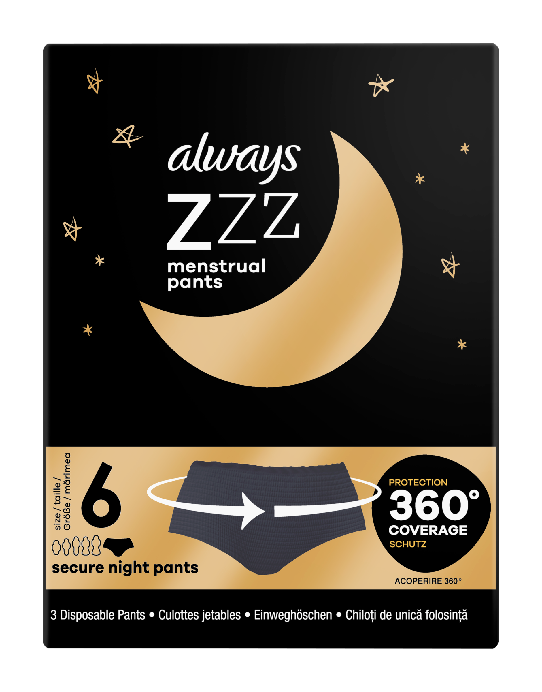 Stresujete se v noci kvůli menstruaci? Objevte menstruační kalhotky Always ZZZ s 360° ochranou pro noci bez obav. Jednorázové menstruační kalhotky Always ZZZ jsou vyrobené z hedvábně měkkého prodyšného materiálu. Absorbují stejné množství tekutiny jako 5 vložek Always Ultra. Jsou navržené tak, aby se přizpůsobily vašemu spodnímu prádlu a zůstaly na místě.