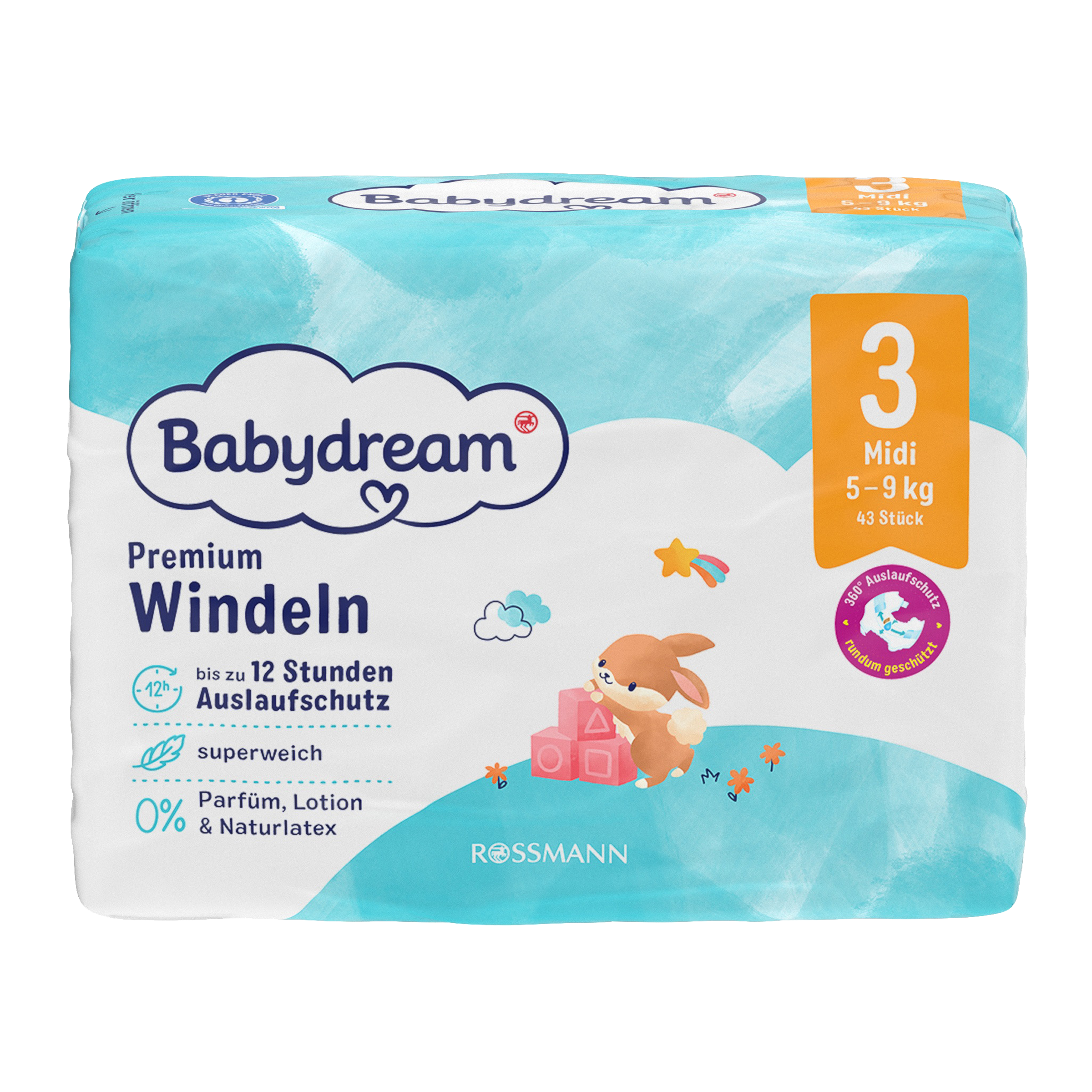 Sametově hebké jednorázové plenky Babydream Premium Midi pro děti od 5 do 9 kg poskytují optimální ochranu citlivé pokožky vašeho dítěte. Zůstávají suché až 12 hodin a mimořádně rychle absorbují tekutinu.