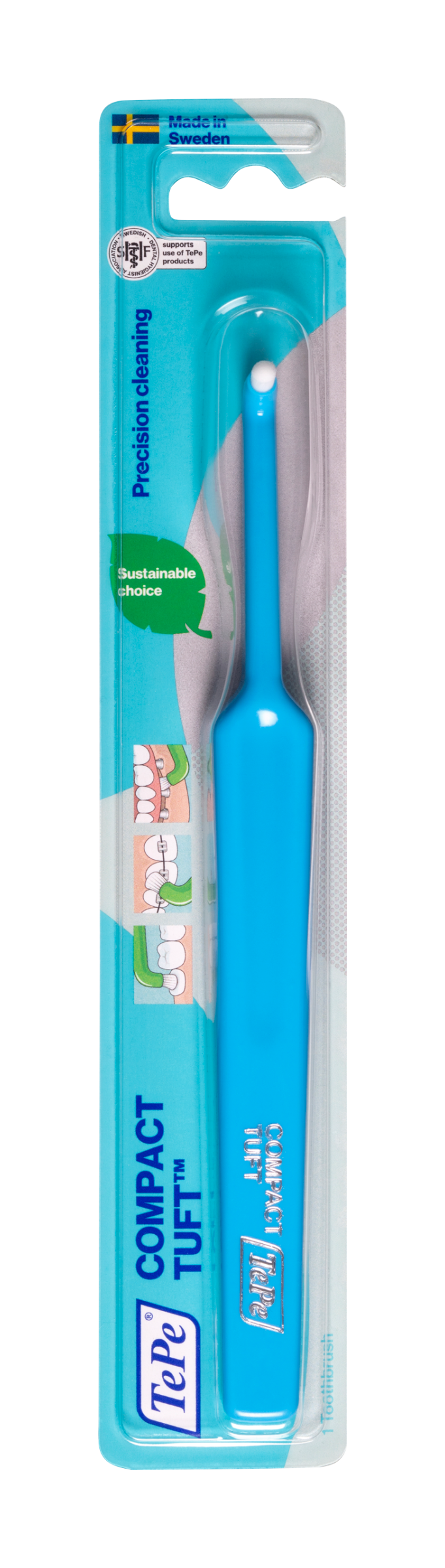 Jednosvazkový kartáček Compact Tuft má zahnutou hlavici s malým, do oblouku zastřiženým snopcem krátkých, extra měkkých vláken. Je ideální pomůckou pro čištění těžko dostupných míst. Kartáček je vhodný pro tzv. solo techniku - čištění každého jednotlivého zubu jemným krouživým pohybem s důrazem na čištění linie dásní.