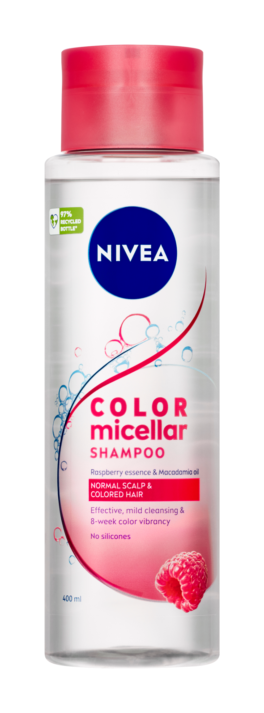 Nivea® Jemný micelární šampon Pure Color s malinovým octem - Jemně čistí a respektuje barevné pigmenty vlasů, aniž by je vysušoval. Složení s pečujícím makadamiovým olejem vyhlazuje a chrání vlasy až 8 týdnů po barvení. Chrání přirozené pH pokožky hlavy, hydratuje, je vhodný pro každodenní použití.