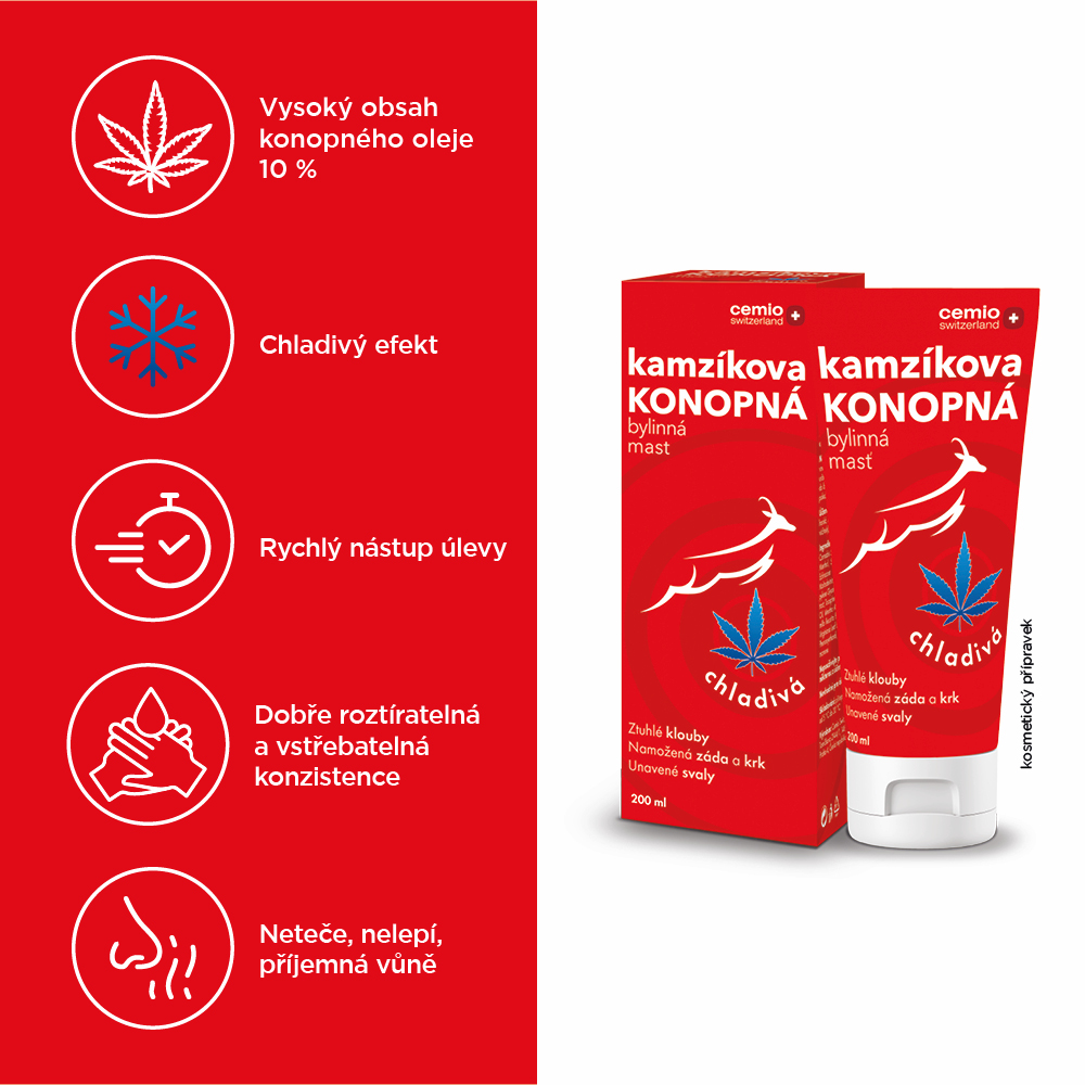 Silná konopná mast s bylinnými extrakty v čistotě 99,7 %. Rychlá úleva pro ztuhlé klouby, unavené svaly a namožená záda a krk. Díky čistě přírodnímu složení je Kamzíkova konopná mast skvělá i pro každodenní použití!