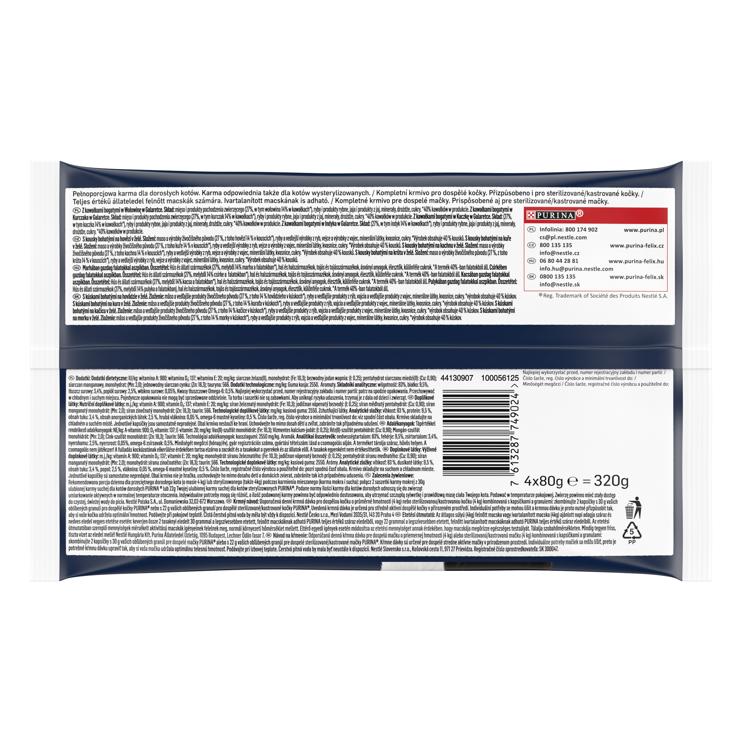 FELIX Deliciously Sliced jsou lahodné plátky pečlivě vařené v páře s vysokým obsahem bílkovin, pokryté chutným želé, které bude vaše kočka milovat! Vypadají, voní a chutnají tak lahodně jako jídlo, které byste si možná připravili sami! Každá receptura se vaří v páře, která plnohodnotně využívá jednotlivé suroviny a zachovává jejich lahodnou chuť. Unikátní jemné plátky jsou podávané v neodolatelně chutném želé. Unikátní jemné plátky jsou podávané v neodolatelně chutném želé. To není všechno! FELIX Deliciously Sliced jsou dostupné v široké řadě lahodných receptur, aby každý den uspokojily lásku vaší kočky po rozmanitosti. FELIX - Jednoduše neodolatelný! Složení balení: 1× s kousky bohatými na hovězí v želé, 1× s kousky bohatými na kuře v želé, 1× s kousky bohatými na kachnu v želé, 1× s kousky bohatými na krůtu v želé 100 % kompletní a vyvážené.