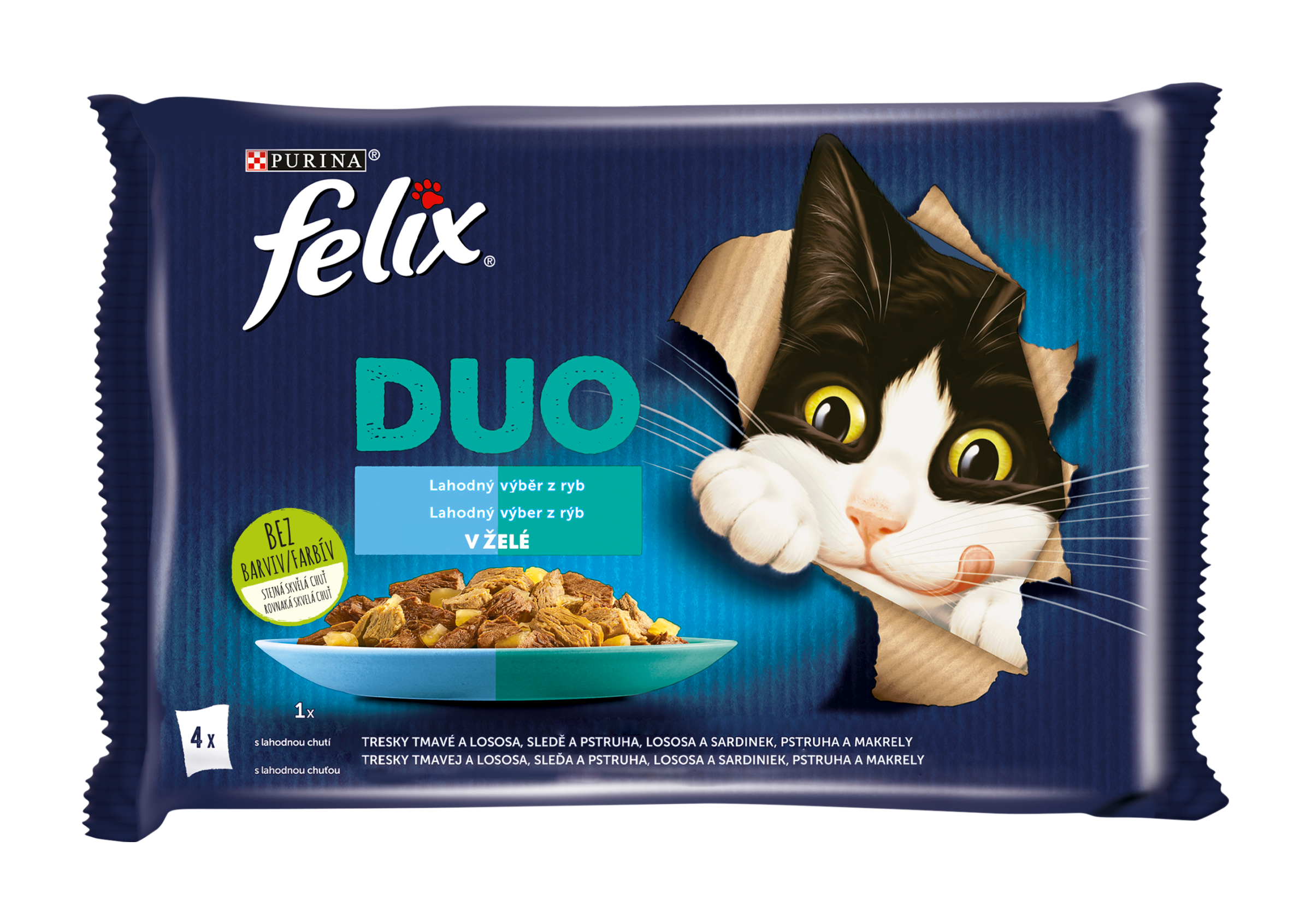 Kompletní krmivo pro dospělé kočky. FELIX® Duo je řada neodolatelných krmiv, která vypadají, voní a chutnají tak lahodně, jako jídlo, které byste sami uvařili. Každá receptura, vyrobená z kvalitních surovin, obsahuje křehké kousky kombinující dvě neodolatelné chutě v želé. Tak si vaše kočka může pochutnat na dvou oblíbených chutích najednou! Zároveň jsou zdrojem omega-6 mastných kyselin a mají správnou kombinaci vitamínů, aby udržely vaši kočku plnou energie a připravenou k uličnictví! Jsou plná dobrot a uspokojí 100 % denních potřeb vaší kočky, když jsou podávána podle krmného návodu. To není všechno! FELIX Duo je dostupný v celé řadě neodolatelných receptur v lahodném želé, aby každý den uspokojil lásku vaší kočky po rozmanitosti. Opravdu dvojnásobně vynikající! FELIX je prostě neodolatelný! 100% kompletní a vyvážené Vitamíny D a E Zdroj omega-6 mastných kyselin, bez přidaných umělých konzervantů.