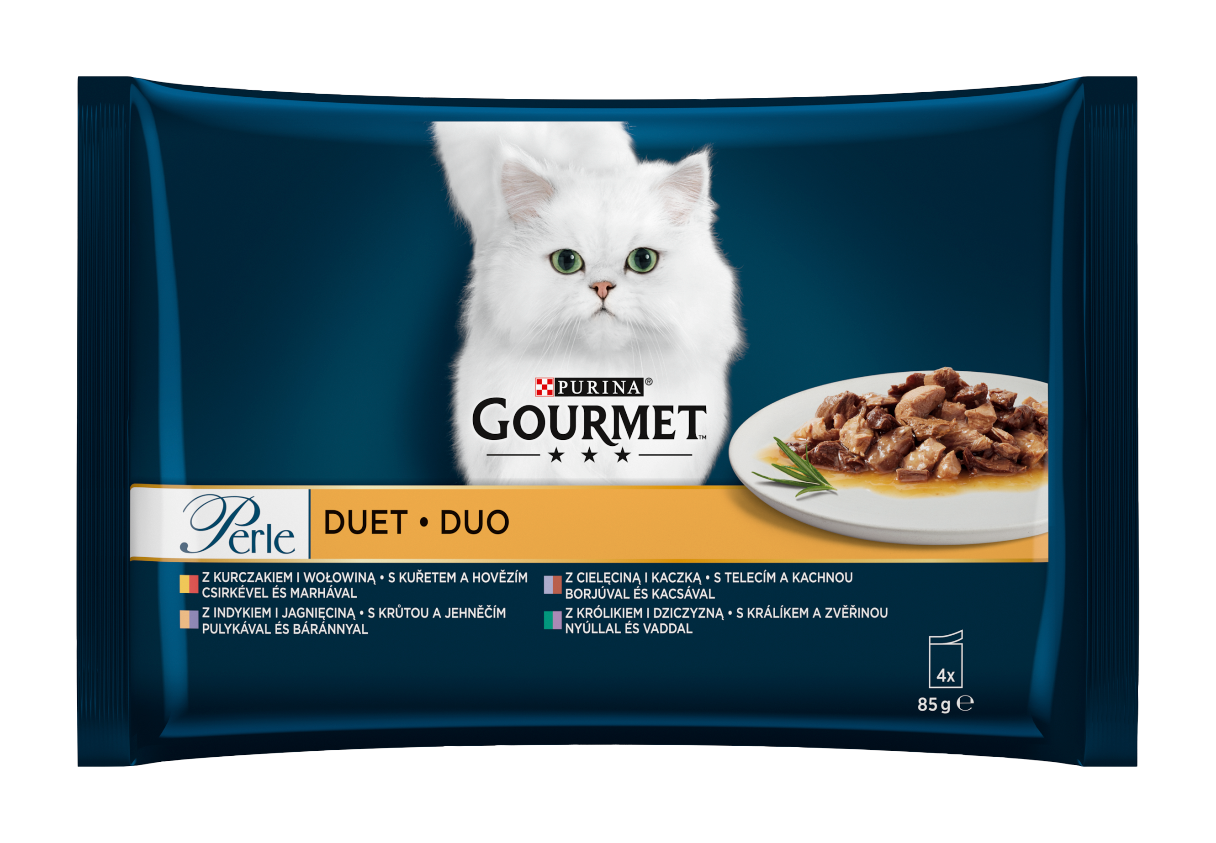 GOURMET™ Perle připravil Duo: pečlivě vybrané kombinace jemných kousků s kuřetem a hovězím, lososem a bělomasými rybami a dalšími vybranými příchutěmi, pokrájené na mini filetky, zlehka povařené a podávané v lahodné šťávě pro potěšení vytříbené chuti vaší kočky. Duo od GOURMET™ Perle, dvojité pokušení pro milovníky masa nebo ryb, pro každodenní neodolatelný chuťový zážitek.
