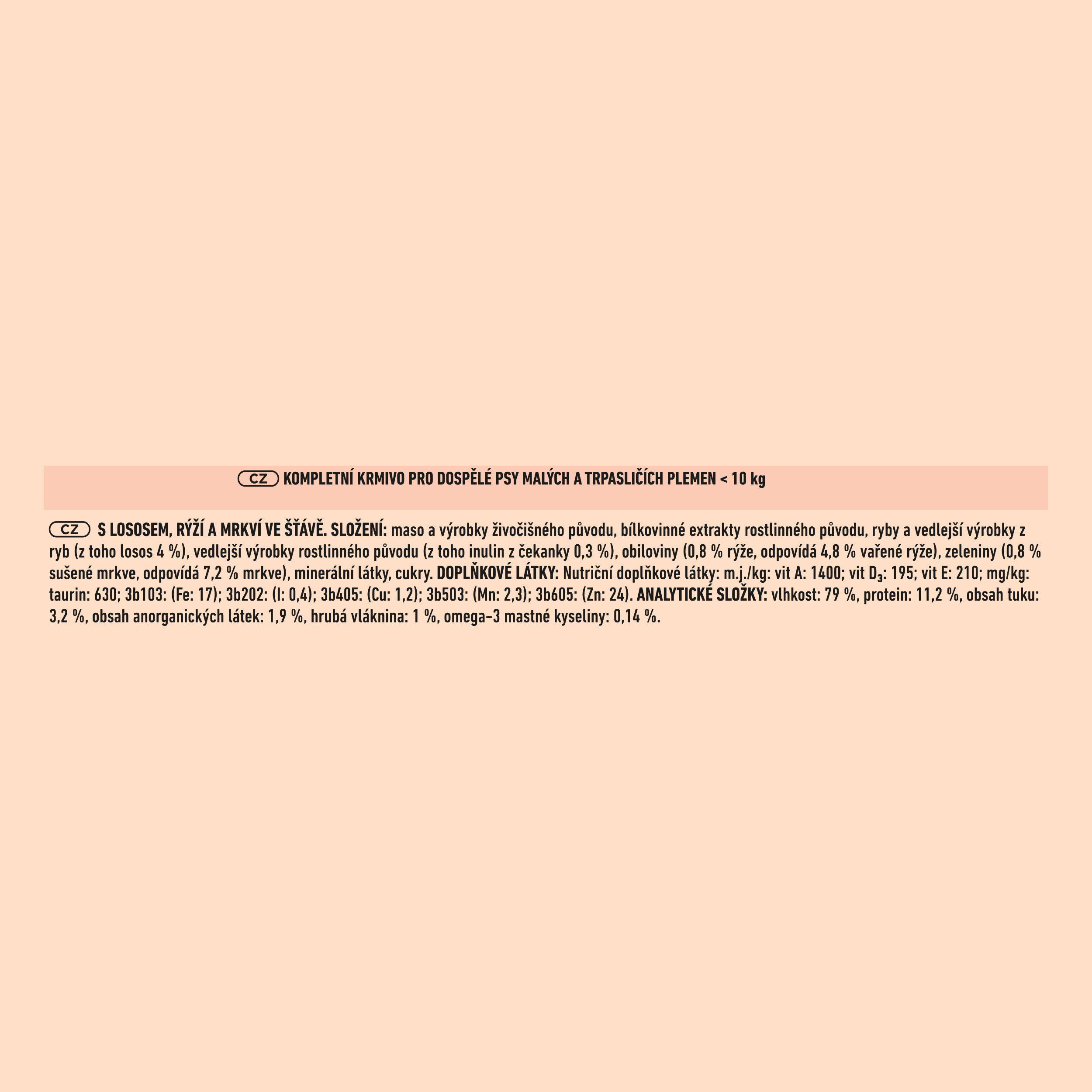 Složení: maso a výrobky živočišného původu, bílkovinné extrakty rostlinného původu, ryby a vedlejší výrobky z ryb (z toho losos 4 %), vedlejší výrobky rostlinného původu (z toho inulin z čekanky 0,3 %), obiloviny (0,8 % rýže, odpovídá 4,8 % vařené rýže), zeleniny (0,8 % sušené mrkve, odpovídá 7,2 % mrkve), minerální látky, cukry.
