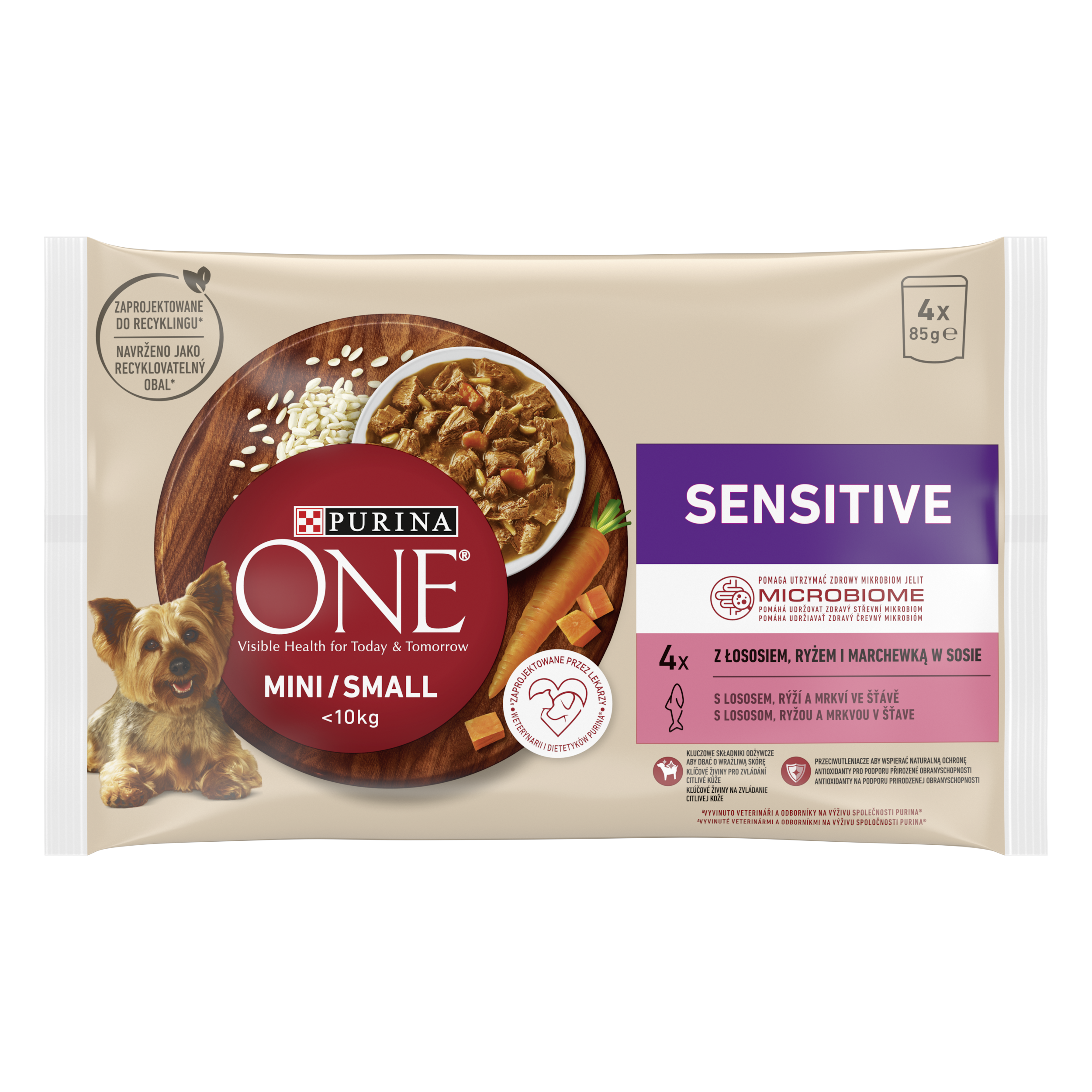 Kompletní krmivo pro dospělé psy malých a trpasličích plemen. Udržovat vyvážený střevní mikrobiom je nezbytné pro dobré zdraví vašeho psa. A to je důvod, proč odborníci společnosti Purina vyvinuli Purina ONE® MINI/SMALL < 10 kg : pokročilou výživu, v podobě delikátních a měkkých kousků ve šťávě, která pomáhá udržovat zdravý střevní mikrobiom nezbytný pro zdraví trávicího traktu a celkovou pohodu vašeho psa.