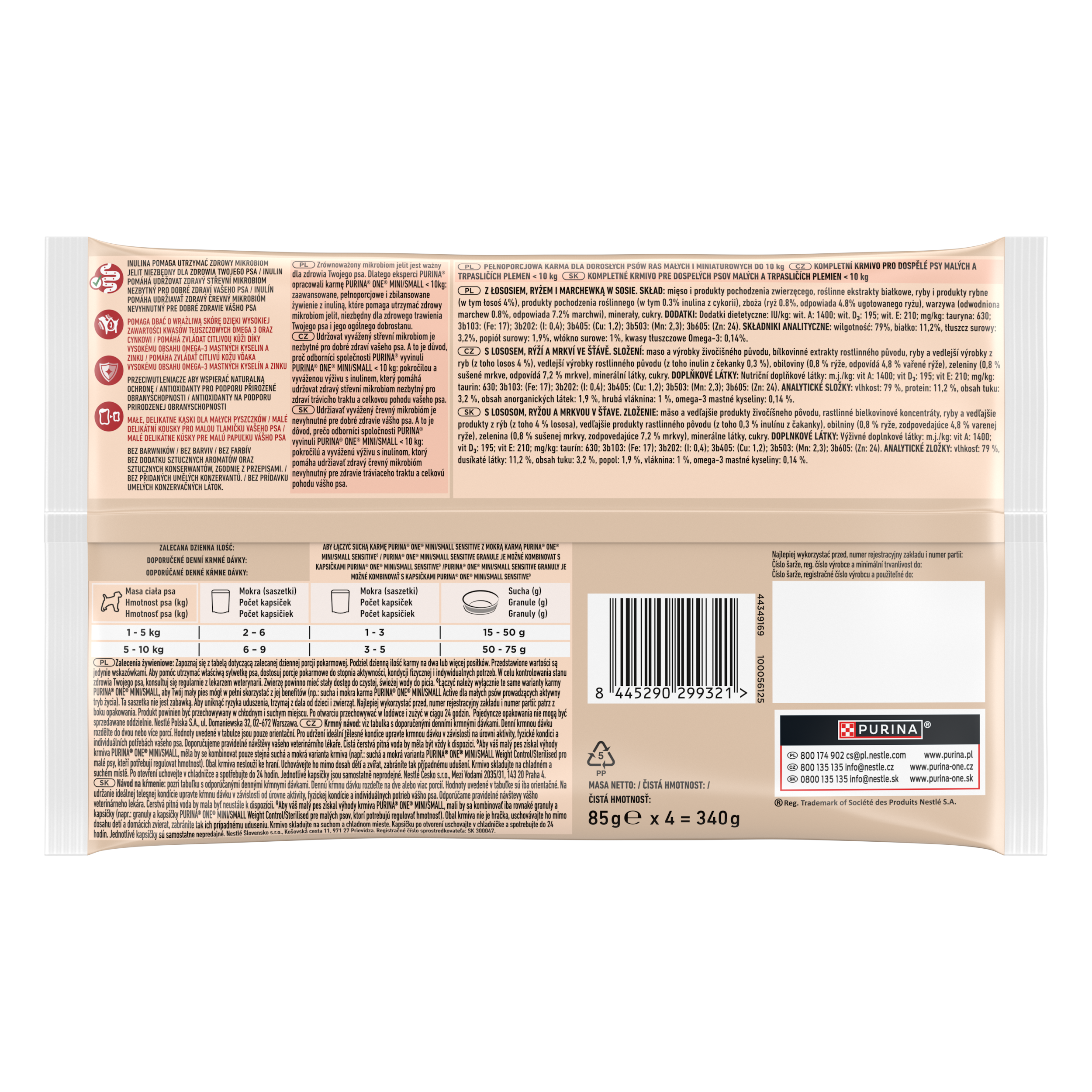 Čistá čerstvá pitná voda by měla být vždy k dispozici. Pouze kapsičky PURINA ONE® MINI/SMALL Sensitive granule je možné kombinovat s kapsičkami PURINA ONE® MINI/SMALL Sensitive. PURINA ONE® MINI/SMALL Sensitive granule je možné kombinovat s kapsičkami Purina ONE® MINI/SMALL Sensitive. Hmotnost psa (kg) Počet kapsiček Počet kapsiček Granule (g) 1 až 5 2 - 6 1 - 3 15 - 50 5 až 10 6 - 9 3 - 5 50 - 75 Aby váš malý pes získal výhody krmiva PURINA ONE® MINI/SMALL, měla by se kombinovat pouze stejná suchá a mokrá varianta krmiva (např.: suchá a mokrá varianta PURINA ONE® MINI/SMALL Weight Control/Sterilised pro malé psy, kteří potřebují regulovat hmotnost). Krmný návod: viz tabulka s doporučenými denními krmnými dávkami. Denní krmnou dávku rozdělte do dvou nebo více porcí. Hodnoty uvedené v tabulce jsou pouze orientační. Pro udržení ideální tělesné kondice upravte krmnou dávku v závislosti na úrovni aktivity, fyzické kondici a individuálních potřebách vašeho psa. Doporučujeme pravidelné návštěvy vašeho veterinárního lékaře. Doporučené denní krmné dávky: viz obal.