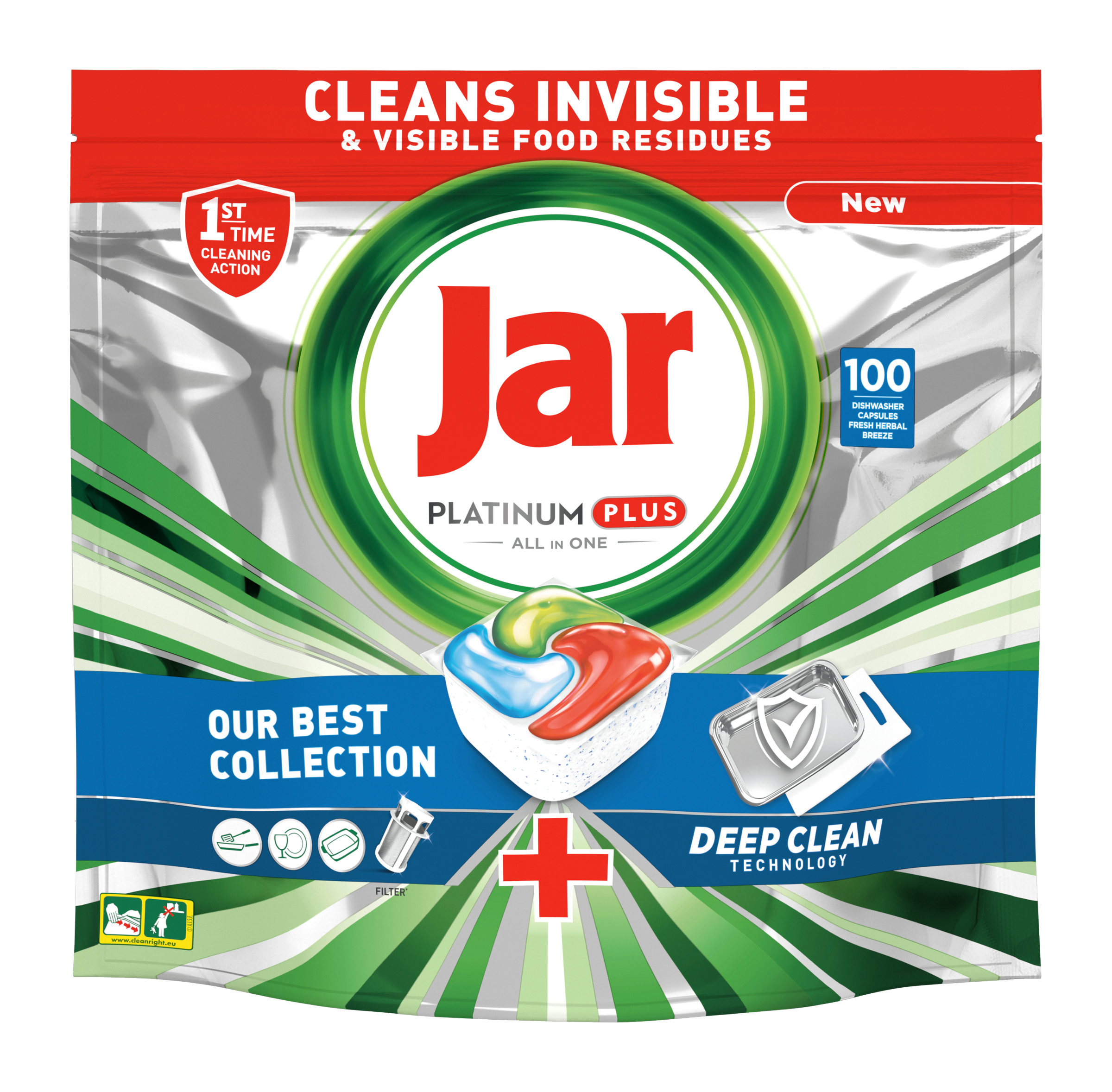 Kapsle Jar Platinum Plus vše v jednom do automatické myčky nádobí zanechávají nádobí čisté jako nové, zaručují nejlepší čisticí účinky od Jaru a dokonce pomáhají odstraňovat zašedlost vznikající časem a obnovují původní lesk nádobí. Kapsle mají zabudovaný systém předmývání, takže nádobí nemusíte předmývat sami. S kapslemi Jar Platinum Plus nebudete muset nádobí předmývat, ušetříte více vody a budete šetrnější k životnímu prostředí. Jar spojuje v jedné účinné kapsli tekutý i práškový prostředek na mytí nádobí. Vysoce rozpustný obal se rychle rozpouští a funguje dobře i při krátkých cyklech, takže nádobí se začíná ihned umývat. A navíc se kapsle tak snadno používají. Kapsli není třeba rozbalovat a stačí ji jen vložit do dávkovacího zásobníku na mycí prostředek.