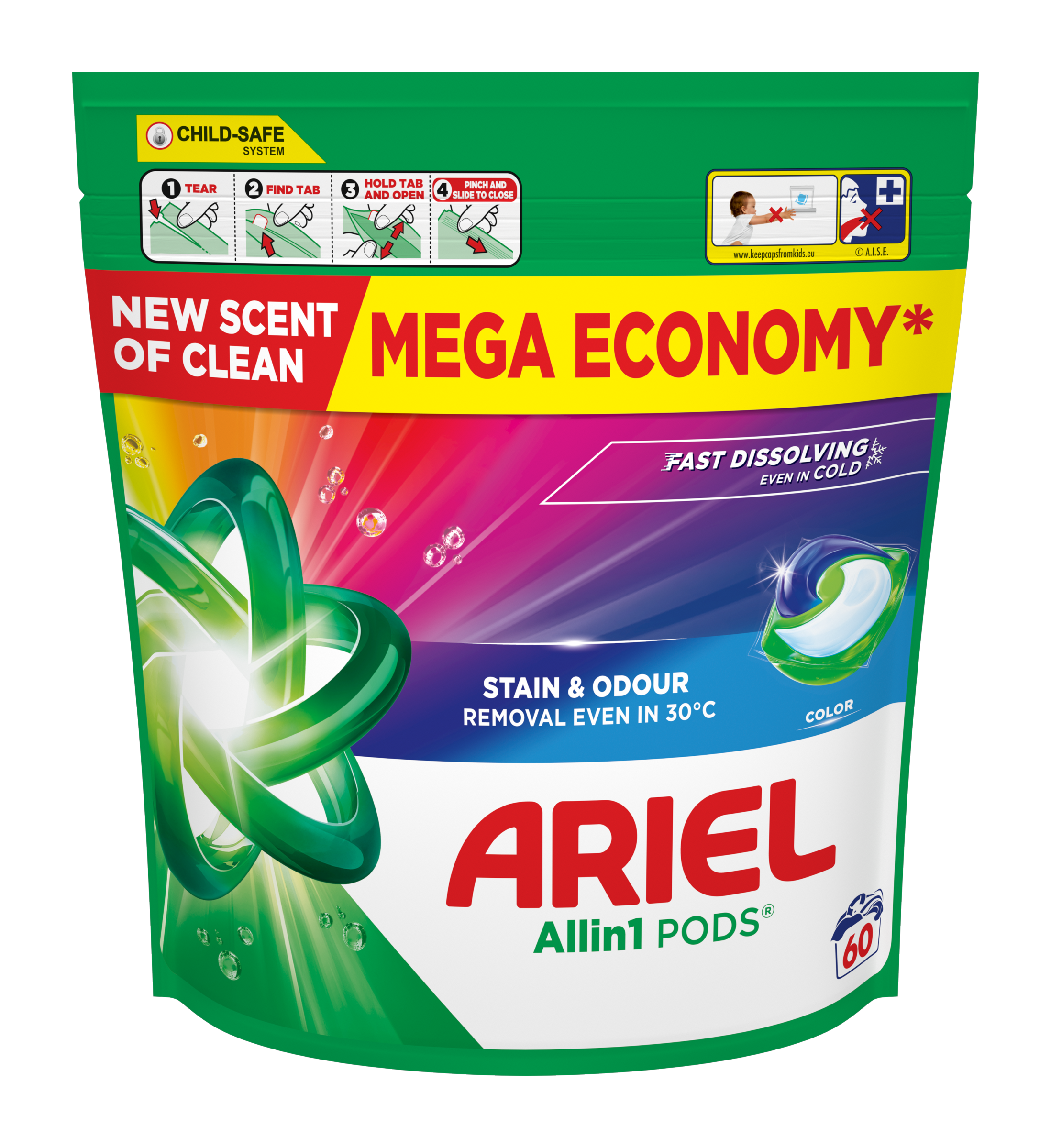 - Rychlé rozpuštění při nízkých teplotách: Ariel Allin1 PODS Color se snadno rozpouštějí i ve studené vodě.