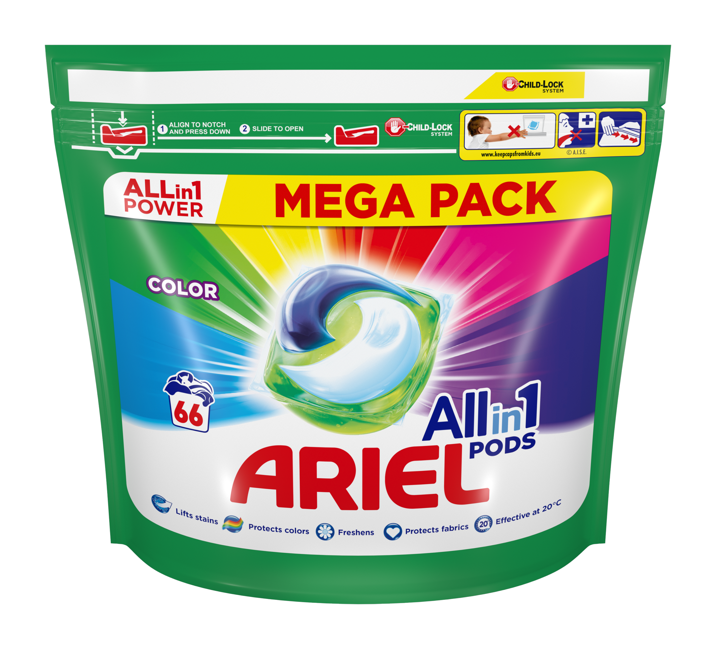 - Kapsle Ariel All-in-1 PODs: 1. odstraňují skvrny 2. chrání barvy 3. osvěžují 4. chrání tkaniny 5. Navrženy pro praní ve studené vodě.