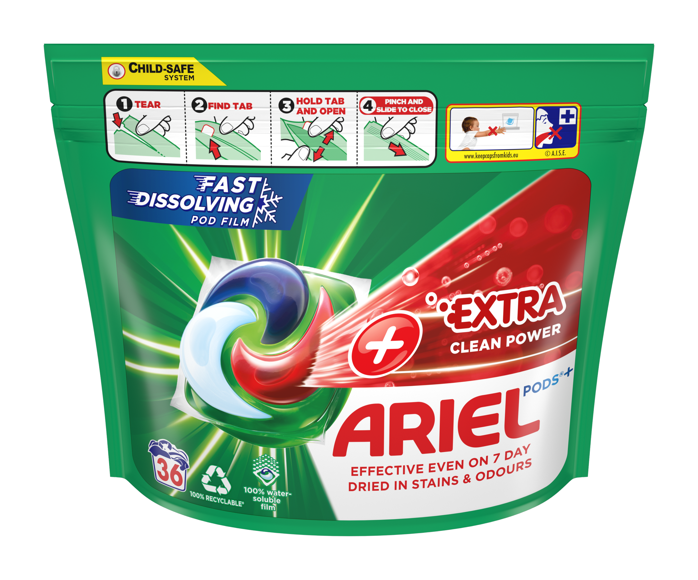 Ariel, značka doporučovaná výrobci Whirlpool, Electrolux, Candy a Beko, představuje Ariel All-in-1 PODS +Extra Clean Power, kapsle s tekutým pracím prostředkem, nejlepší All-in-1 PODS od značky Ariel. Dodávány s červenou komůrkou navíc a schopností odstranit dokonce 7 dní zaschlé skvrny. Varování: Tento výrobek může být škodlivý a způsobit vážná zranění.