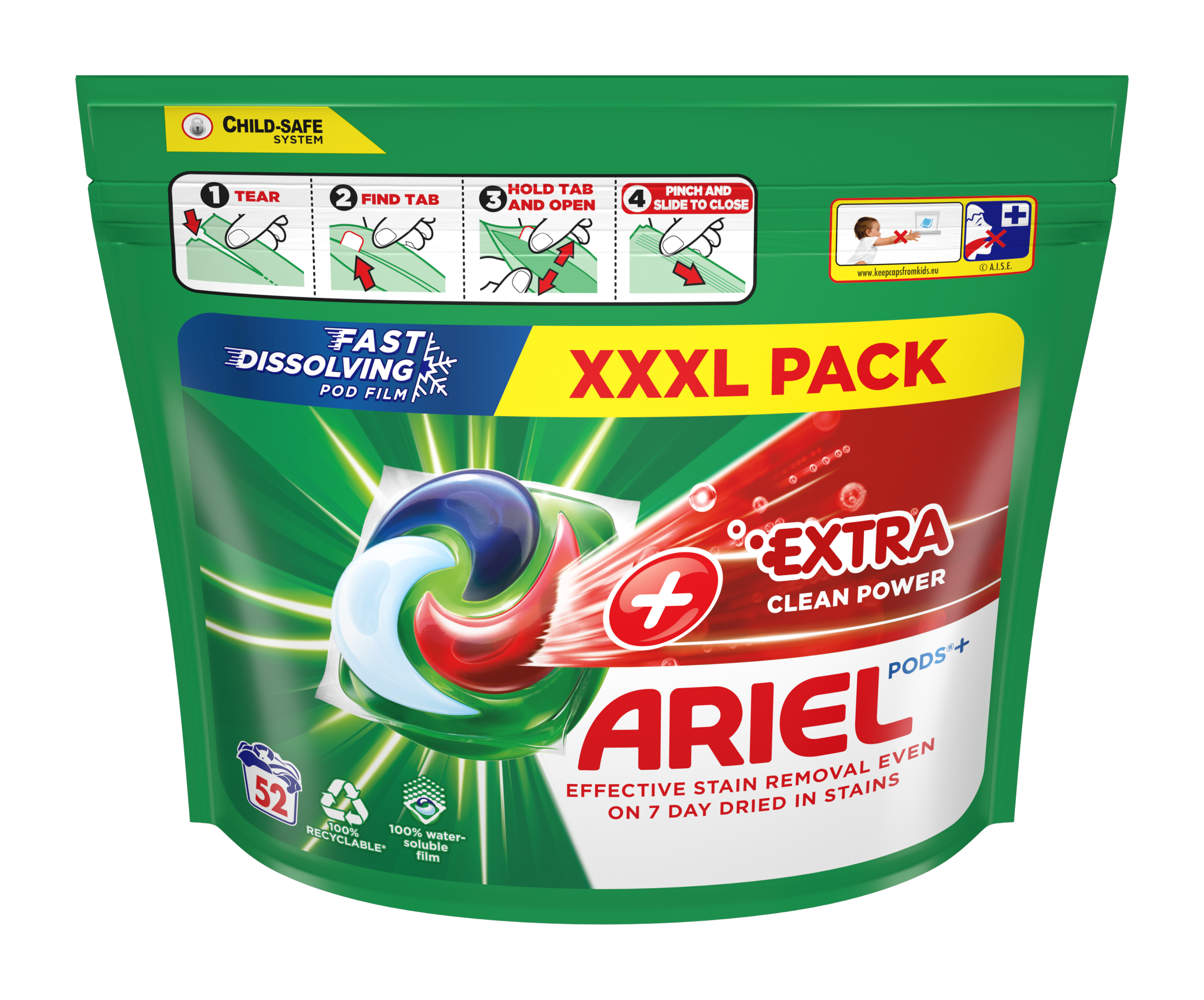 Ariel, značka doporučovaná výrobci Whirlpool, Electrolux, Candy a Beko, představuje Ariel All-in-1 PODS +Extra Clean Power, kapsle s tekutým pracím prostředkem, nejlepší All-in-1 PODS od značky Ariel. Dodávány s červenou komůrkou navíc a schopností odstranit dokonce 7 dní zaschlé skvrny. Varování: Tento výrobek může být škodlivý a způsobit vážná zranění. Kapsle s pracím prostředkem Ariel All-in-1 PODS vždy uchovávejte mimo dosah dětí. Další informace najdete na keepcapsfromkids.eu.