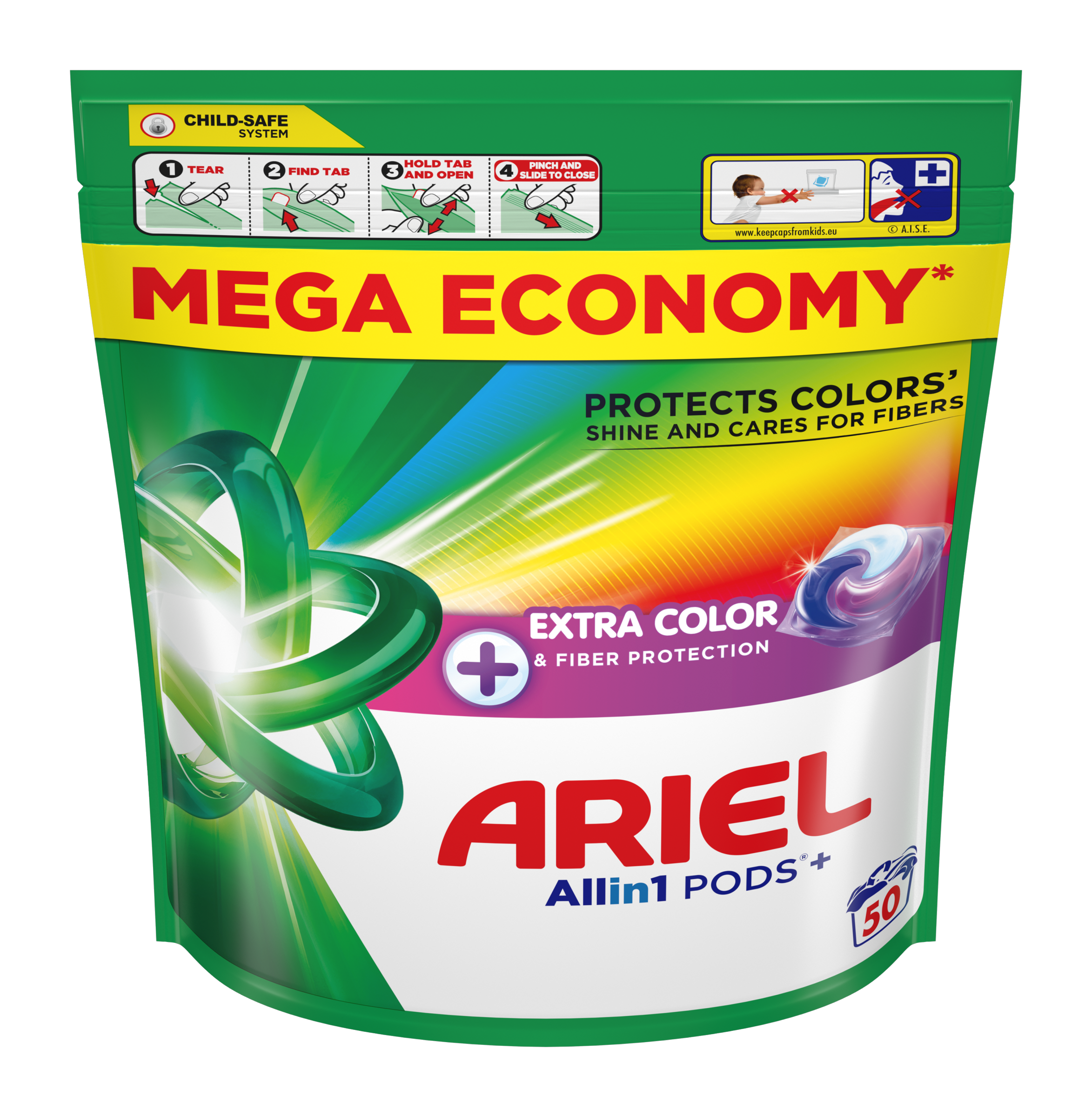 Ariel Allin1 PODS+ nabízí jedinečné řešení pro dokonale čisté prádlo a dlouhotrvající zářivost barev. Díky speciální fialové komůrce chrání nejen barevnost vašeho oblečení, ale také jemnost a kvalitu vláken. Tyto prací kapsle se rychle rozpouštějí i ve studené vodě a poskytují skvělé výsledky i při praní na nízké teplotě. Pro maximální účinnost doporučujeme vkládat kapsli do prázdného bubnu a poté přidat prádlo.