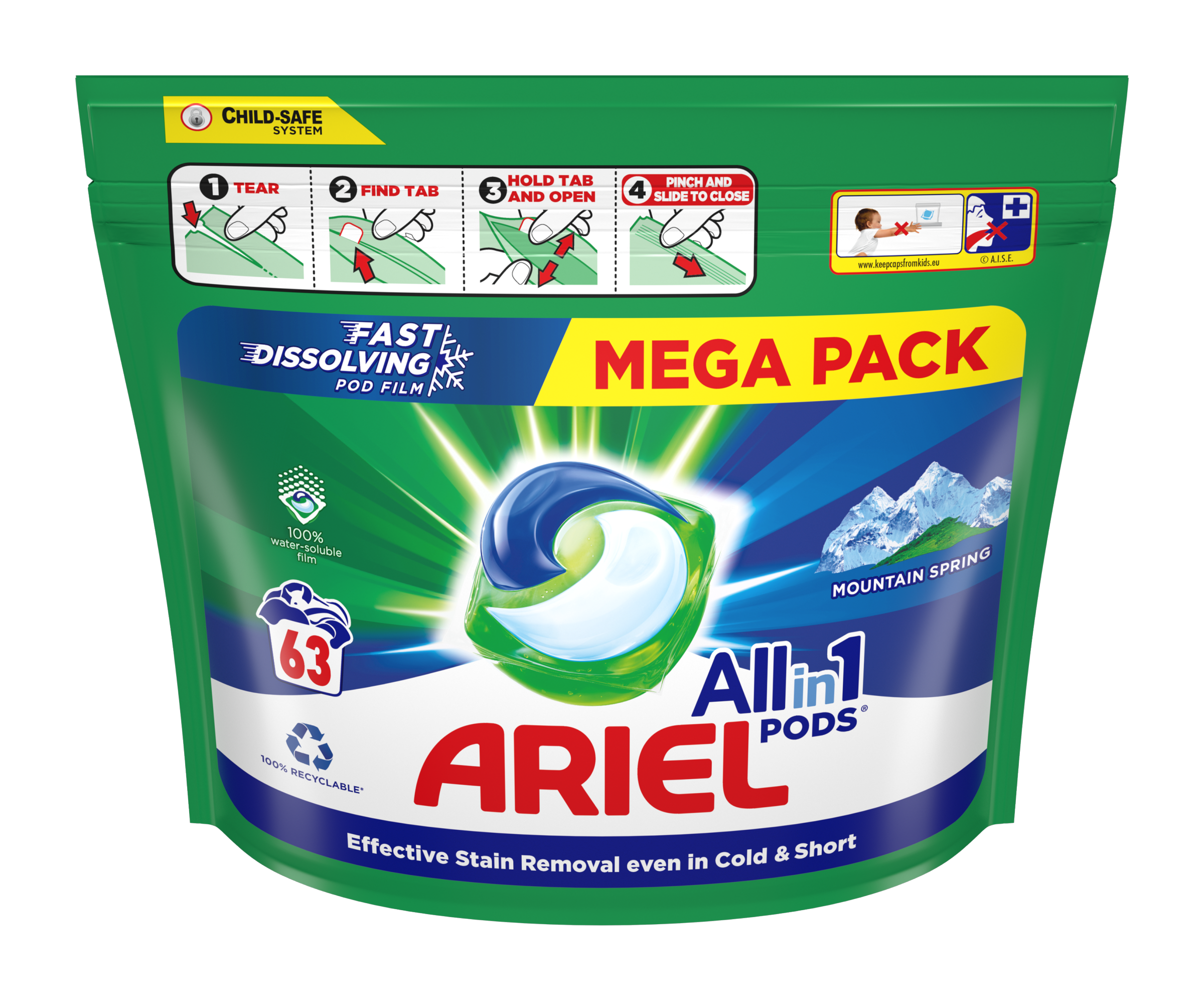 Ariel, značka doporučovaná výrobci praček Whirlpool, Electrolux, Candy a Beko, představuje prací prostředek v kapslích Ariel All-in-1 PODS Mountain Spring, který dokonale odstraňuje skvrny dokonce i při nižších teplotách a kratším cyklu. Jsou speciálně navrženy pro praní při nižších teplotách s unikátními technologiemi, jako je např. Cool Clean. Varování: Tento výrobek může být škodlivý a způsobit vážná zranění. Kapsle s pracím prostředkem Ariel All-in-1 PODS vždy uchovávejte mimo dosah dětí. Další informace najdete na keepcapsfromkids.eu.