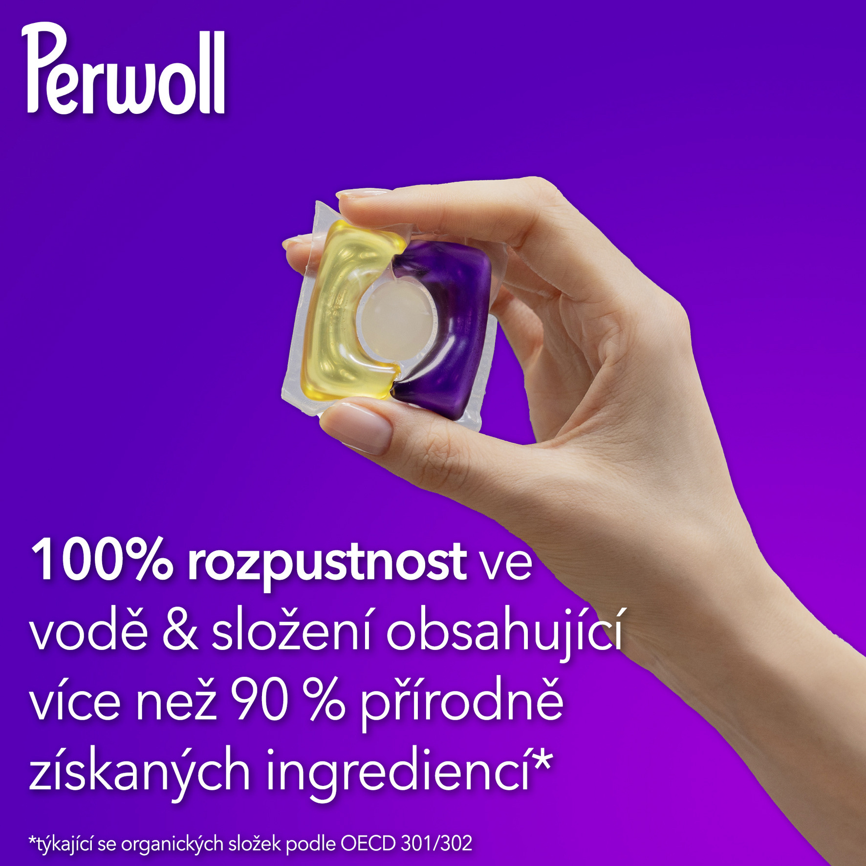 Nové? NE, vyprané Perwoll Black kapslemi! Objevte praktický formát pracích kapslí Perwoll Black s novým složením Triple Renew, které poskytují ideální péči o tmavé oblečení! Prací kapsle na tmavé prádlo nejen šetrně čistí, ale také poskytují tu nejlepší péči o vlákna, takže vaše tmavé oblečení bude vypadat jako nové! To vše v kombinaci se skvělou vůní, která zabezpečuje dlouhotrvající svěžest oblečení. Tento předdávkovaný prací prostředek je vhodný pro praní různých druhů tkanin. Výhody pracích kapslí Perwoll Black s novým složením Triple Renew: Obnova vláken Obnova barev Lepší svěžest Zvolte si Perwoll, prací prostředek určený pro tmavé prádlo, který přesahuje rámec běžného čištění, a dopřejte svému oblečení péči, kterou si zaslouží. Pečujte o své oblečení i o planetu: Kapsle jsou 100% rozpustné ve vodě a složení obsahuje více než 90 % přírodně získaných ingrediencí*. Varování: Způsobuje silné podráždění očí. Může způsobit alergickou reakci. * Dokázáno laboratoří Henkel (Německo, 2021).