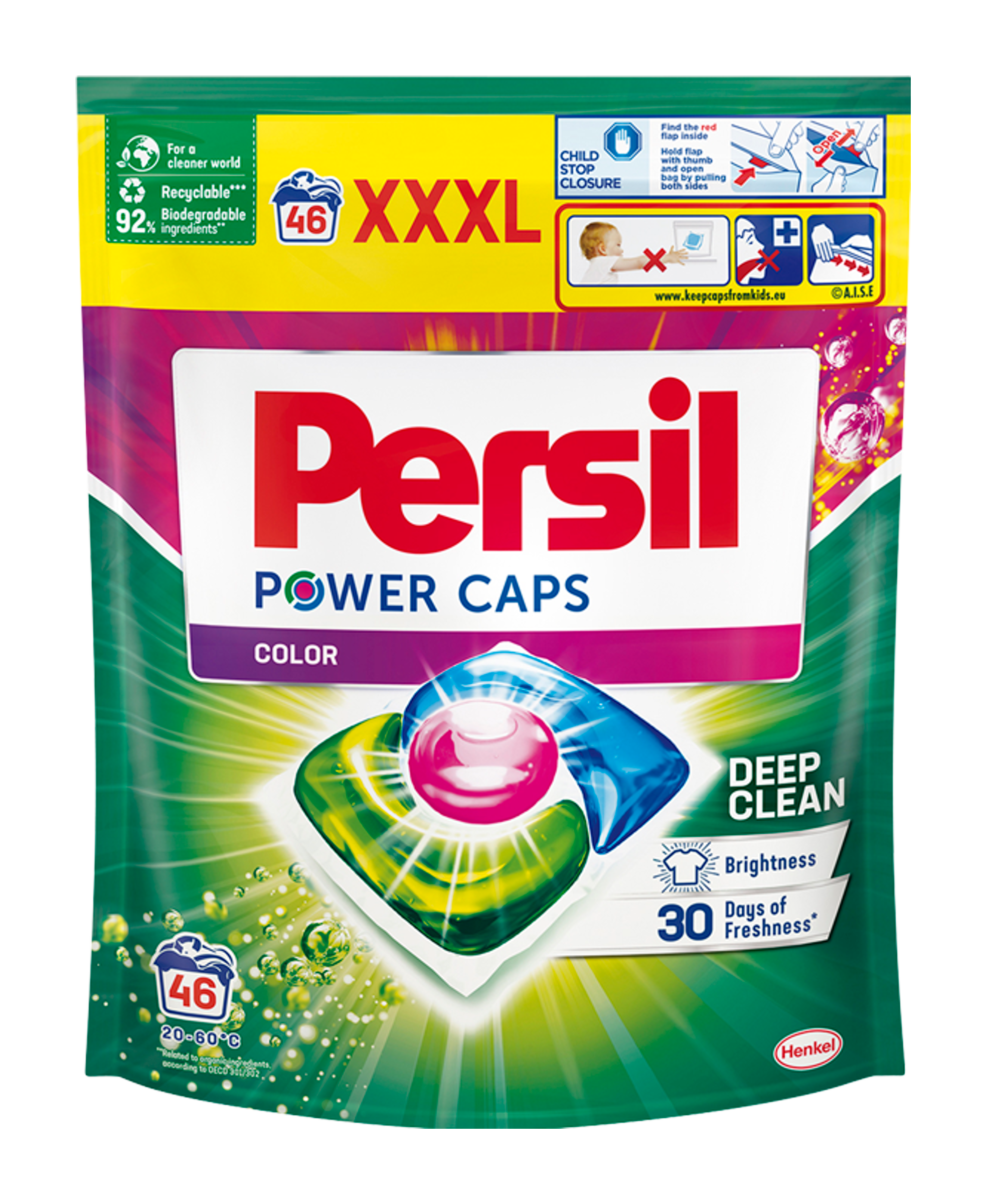 Kapsle na praní pro perfektní výsledek se složením z 92 % biologicky rozložitelných látek** Kapsle na praní Persil Power Caps s technologií Deep Clean obsahují jedinečnou kombinaci aktivních složek, které působí proti odolným skvrnám. Prací prostředek proniká hluboko do vláken a odstraňuje i ty nejmenší molekuly špíny pro dokonalý výsledek a zářivě čisté oblečení. Dopřejte si dokonalou čistotu a dlouhotrvající svěžest Persil. Persil Power Caps jsou účinné i při praní na nízké teploty, už od 20 °C. Pro čistější svět jsou prací kapsle dodávány v recyklovatelném obalu. Chrání nejen oblečení, ale i planetu. Složení pracího gelu v kapslích obsahuje 92 %** biologicky rozložitelných složek. Navíc je efektivní i při praní již od 20°C, a napomáhá nám tak šetřit energii. Persil už více než 100 let vyrábí vysoce kvalitní prací prostředky, díky kterým barvy neblednou a bílé oblečení září. Naše oddanost řemeslu z nás udělala značku, kterou si lidé spojují s kvalitními výrobky a spolehlivými výsledky. Chceme i nadále vítězit nad odolnými skvrnami - a zároveň se chovat šetrně k naší planetě. Persil už více než 100 let vyrábí vysoce kvalitní prací prostředky, díky kterým barvy neblednou a bílé oblečení září. Naše oddanost řemeslu z nás udělala značku, kterou si lidé spojují s kvalitními výrobky a spolehlivými výsledky. Chceme i nadále vítězit nad odolnými skvrnami - a zároveň se chovat šetrně k naší planetě. Výhody produktu: - Perfektní čistota i při nízkých teplotách (20 - 95°C) - Účinné odstranění skvrn - Dlouhotrvající svěžest - 92 % biologicky rozložitelných složek** - Recyklovatelný obal