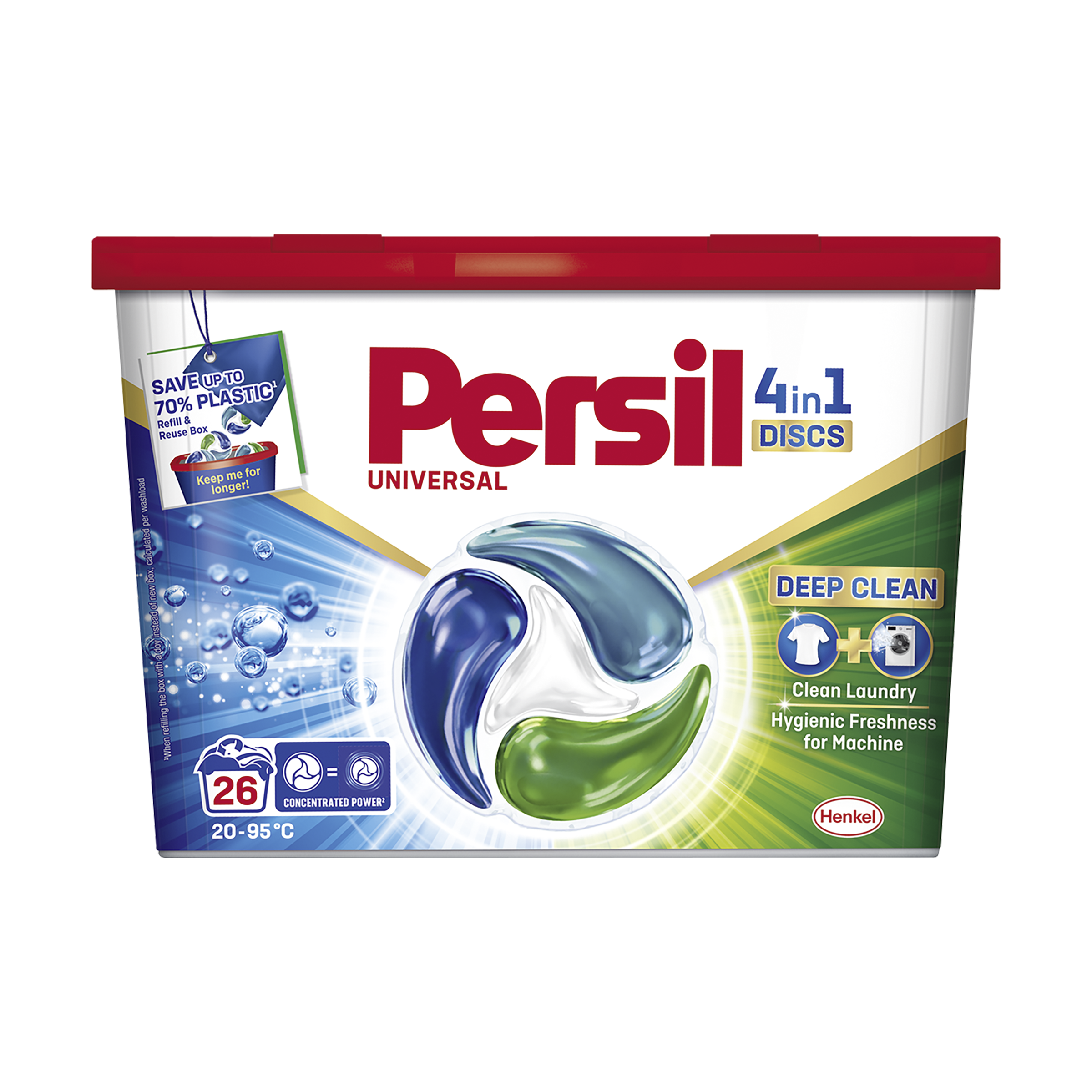 Persil Deep Clean 4v1 Discs Universal - Zažijte hloubkově čisté prádlo a hygienicky svěží pračku díky jedinečnému složení Persil. Výkonná čtyřkomorová gelová kapsle Persil je nyní kompaktovaná pro vynikající výkon a nižší dopad na životní prostředí díky nižšímu množství použitých materiálů. I po vyprání může z pračky vycházet nepříjemný zápach, protože po praní znečištěného prádla se v pračce mohou usazovat nečistoty. Pro dosažení opravdové čistoty, kterou pro své oblečení potřebujete, se můžete vždy spolehnout na Persil Deep Clean. Jedinečné složení pracího prostředku proniká hluboko do vláken, kde rozloží i ty nejodolnější skvrny a odstraní je. Složení je navrženo tak, aby vašemu oblečení dodalo pocit svěžesti a čistoty, poté působí hluboko uvnitř mechanismu pračky a odstraňuje nečistoty, které mohou způsobovat nepříjemný zápach. Výhody výrobku: Hloubkově čistí prádlo a zanechává pračku hygienicky svěží Proniká hlouběji do pračky a odstraňuje nepříjemné pachy 100% recyklovatelný obal a 92% biologicky rozložitelných složek* Prací kapsle jsou účinné i pro plnou pračku prádla Šetří energii díky praní při nízkých teplotách od 20 °C Kompaktní kapsle : méně vody, méně fólie, méně plastu, menší spotřeba energie Fólie 100% rozpustná ve vodě Opakovaně použitelná krabička Za čistší svět: Prací prostředek Persil šetří energii při každém praní i při velkém množství prádla při nízkých teplotách od 20 °C díky svému silnému a účinnému složení ve 100% recyklovatelném obalu a obsahuje 92 % biologicky rozložitelných složek*. * Týká se organických složek, podle OECD 301/302.
