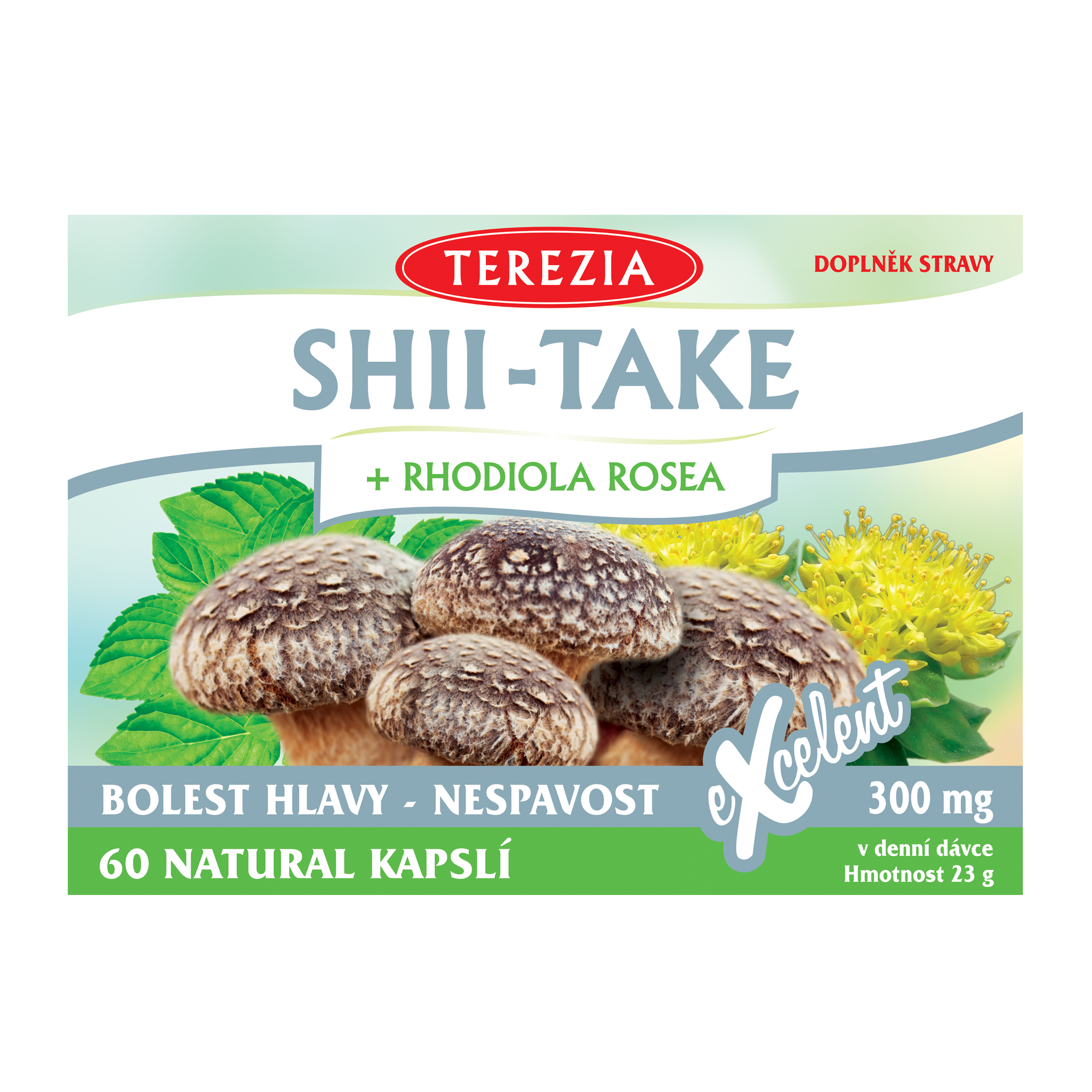 1 kapsle obsahuje 300 mg směsi SHII-TAKE + RHODIOLA ROSEA [prášek celé lyofilizované houby shii-take (Lentinula edodes) 150 mg, extrakt rozchodnice růžové (Rhodiola rosea) 80 mg, extrakt meduňky lékařské (Melissa officinalis) 70 mg]. Obal kapsle: celulóza.