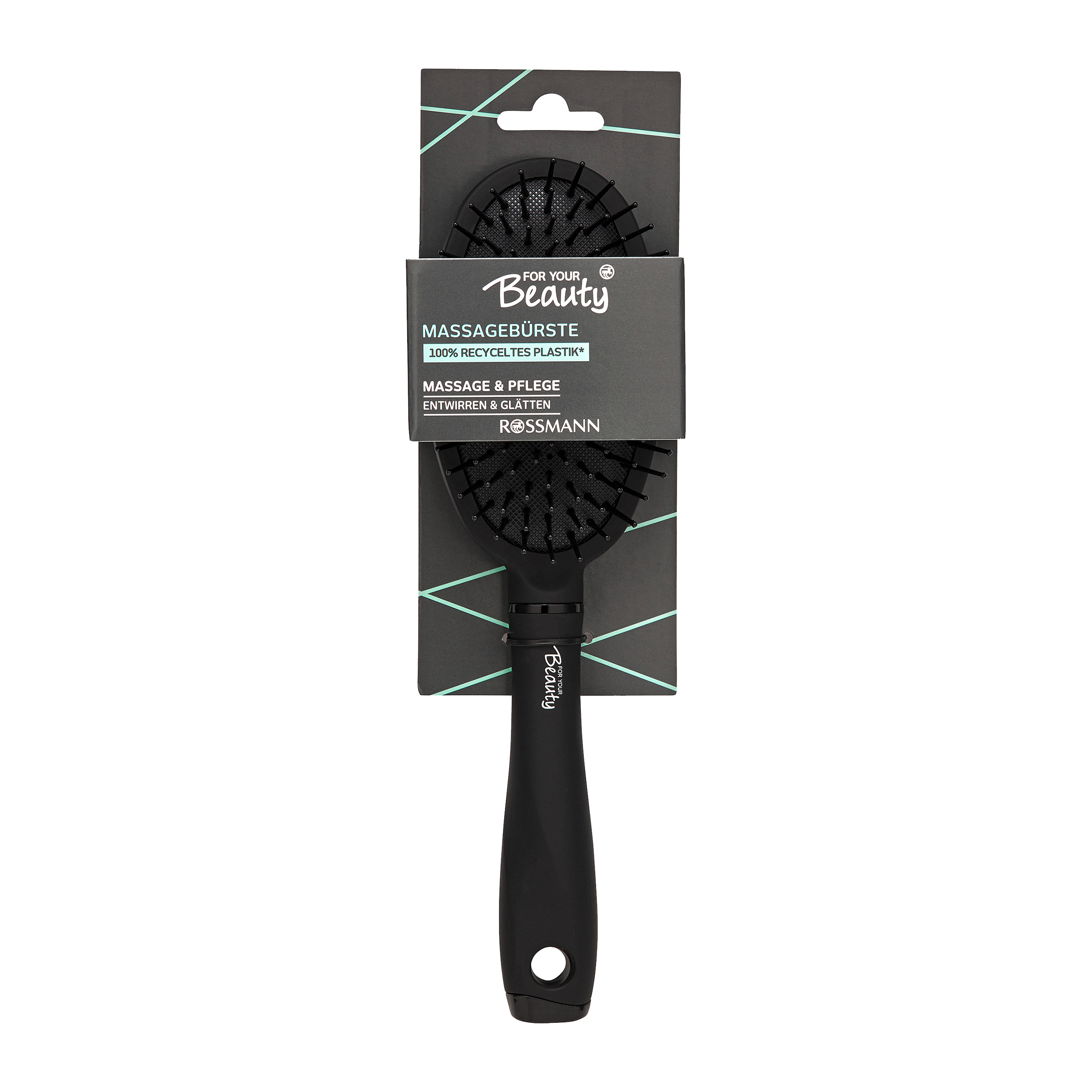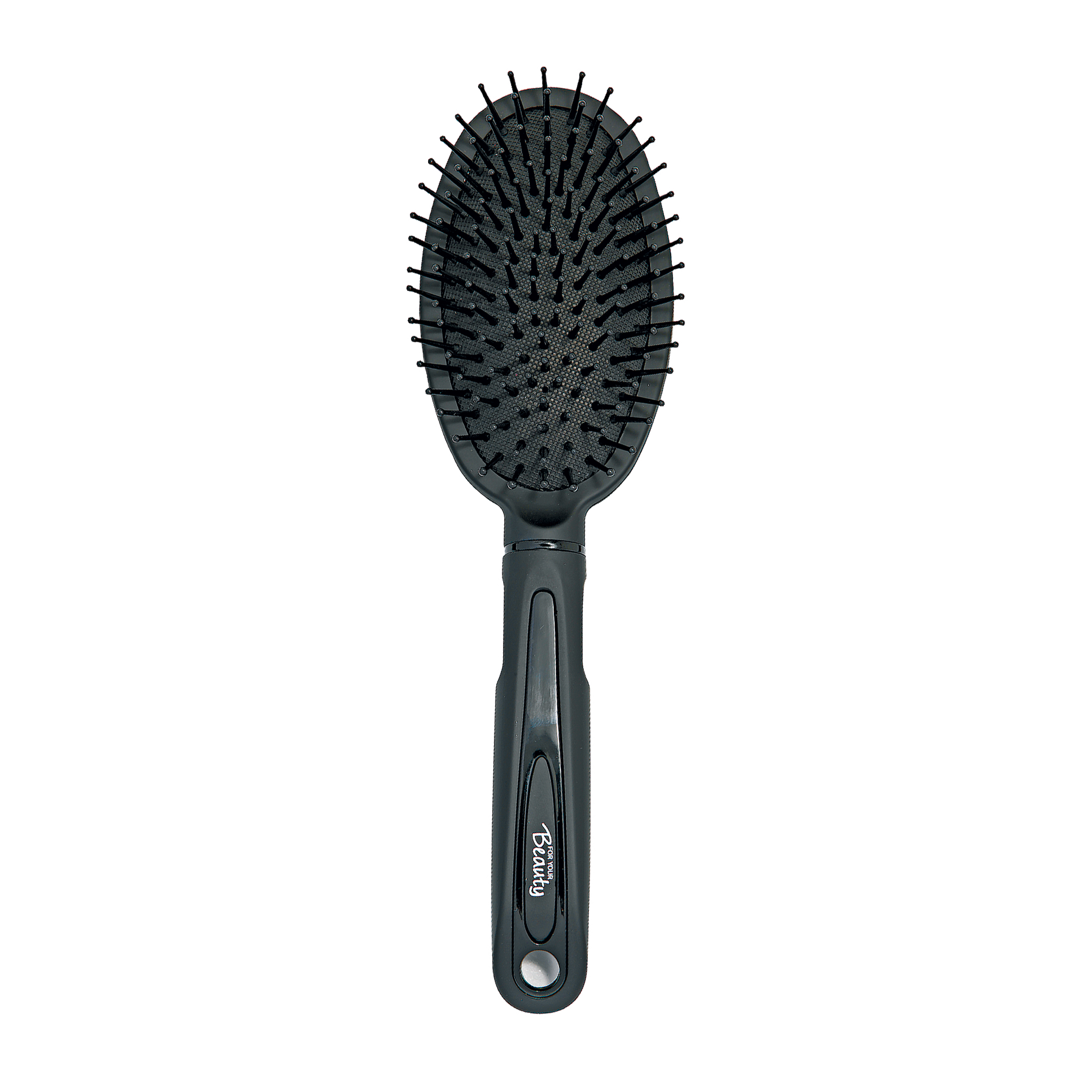Středně velký oválný masážní kartáč na vlasy s rukojetí a štětinami zasazenými do měkkého polštářku, díky kterému se při česání štětiny přizpůsobují tvaru hlavy a jemně ji masírují. S praktickým očkem na pověšení.