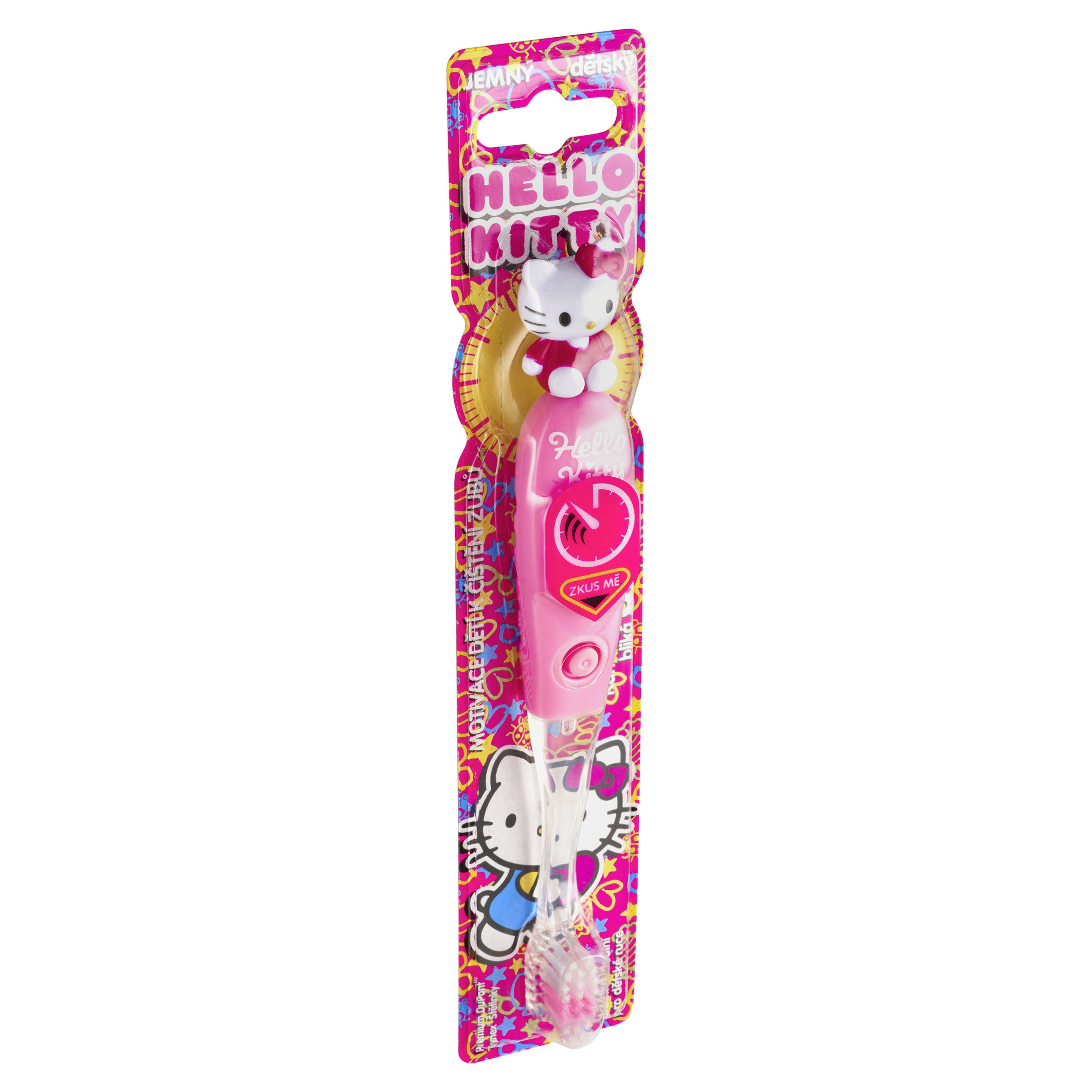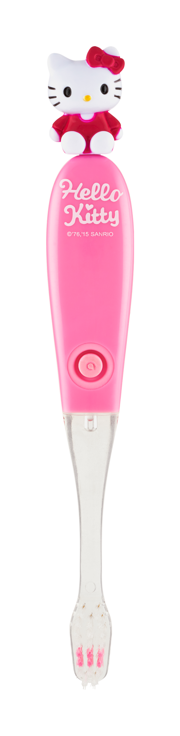 Kartáček bliká 60 sekund pro správnou dobu čištění zubů* *Stomatologové doporučují čistit každé patro zubů po dobu 60 sekund. - Jemné štětinky DuPont™ Tynex® USA pro bezpečné a kvalitní vyčištění zubů - Vyvinuto speciálně pro dětské zoubky Vyvinuto pro motivaci a výuku dětí. Kartáček dětem pomáhá, díky blikání, dodržovat ideální délku čištění zubů a oblíbená postavička Hello Kitty je motivuje k pravidelnosti čištění zubů, protože i kočička Hello Kitty musí mít krásně čisté zuby. Děti s kartáčkem Hello Kitty čištění zubů milují. Pomáhá jim každodenní rutinu udělat zábavnější. Ergonornické držátko padne přesně do dětské ruky a jemné štětinky DuPont™ Tynex® zuby dokonale a jemně vyčistí. V prodeji také zubní pasta Hello Kitty s jahodovou příchutí, ústí voda pro ještě důkladnější ústní hygienu a další druhy zubních kartáčků, dentálních sad a produktů, díky kterým budou Vaše děti čištění zubů milovat. Bezpečnost testována v souladu s EMC direktivou 2004/108/EU.
