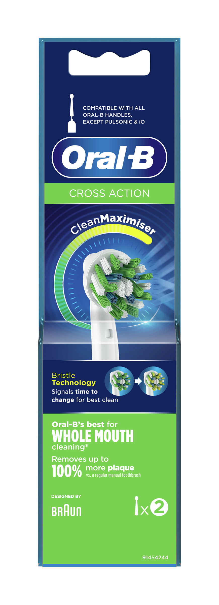 Kartáčková hlava CrossAction má coby jedna z prémiových kartáčkových hlav Oral-B dokonale zkosená vlákna pod úhlem 16 stupňů, která odstraňují až o 100 % více zubního plaku než běžný manuální zubní kartáček. Vylepšené kartáčkové hlavy Oral-B CrossAction obsahují technologii CleanMaximiser, takže zelená vlákna zežloutnou, což pomáhá zaručit optimální výkon kartáčkové hlavy a to nejlepší čištění. Unikátní vlákna pronikají hluboko do mezizubních prostor, kde odstraňují zubní plak, a celou ústní dutinu vyčistí lépe než běžný manuální zubní kartáček. Kompatibilní se všemi elektrickými kartáčky Oral-B kromě modelů Pulsonic & iO.