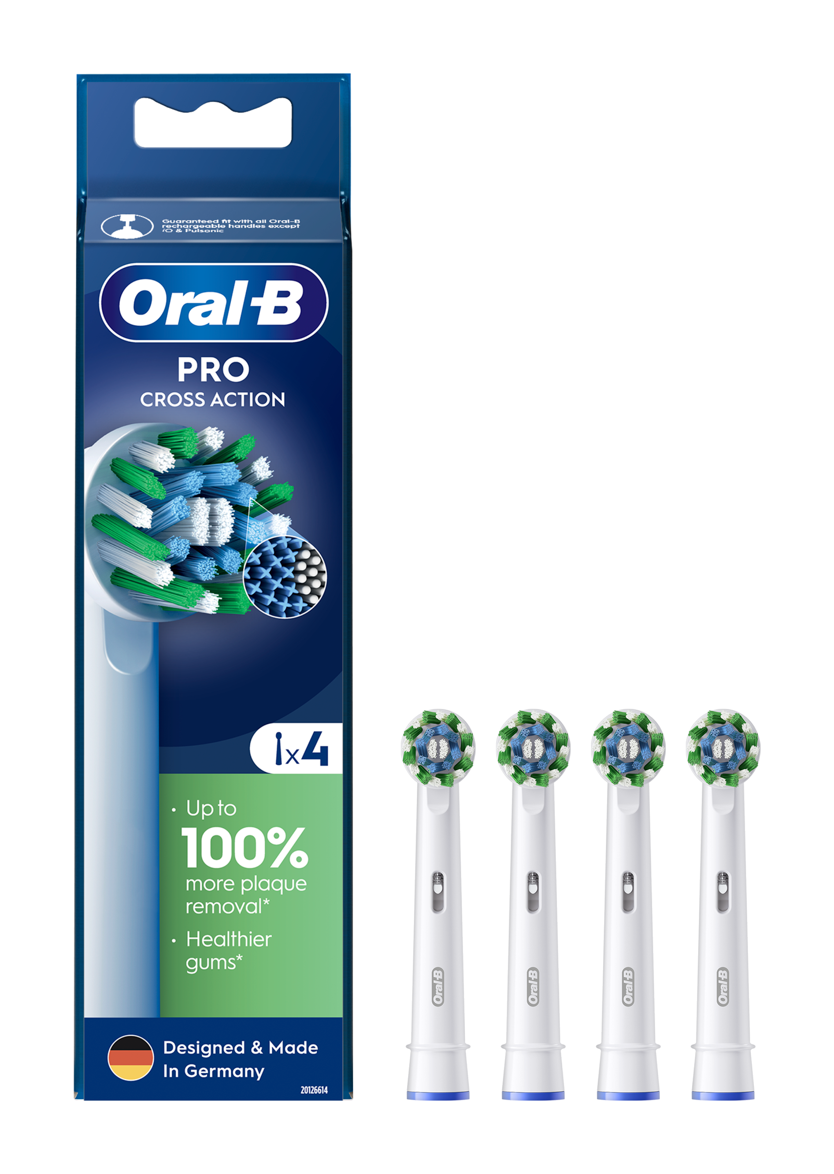 Kartáčková hlava Oral-B Pro Cross Action má více než 2200 dokonale zkosených vláken, která v porovnání s manuálním zubním kartáčkem odstraňují až o 100 % více bakteriálního zubního plaku a zajišťují čistší zuby a zdravější dásně. Originální kartáčkové hlavy Oral-B jsou navrženy s novými vlákny ve tvaru X, která čistí v místech, kam kulaté hlavy nedosáhnou. Ukazatel opotřebení kartáčkové hlavy změní vlákna ze zelené barvy na žlutou a ukazuje tak, kdy je hlavu nutné vyměnit pro 100% účinnost čištění. Zaručená kompatibilita se všemi dobíjecími zubními kartáčky Oral-B, s výjimkou zubních kartáčků Pulsonic a iO.