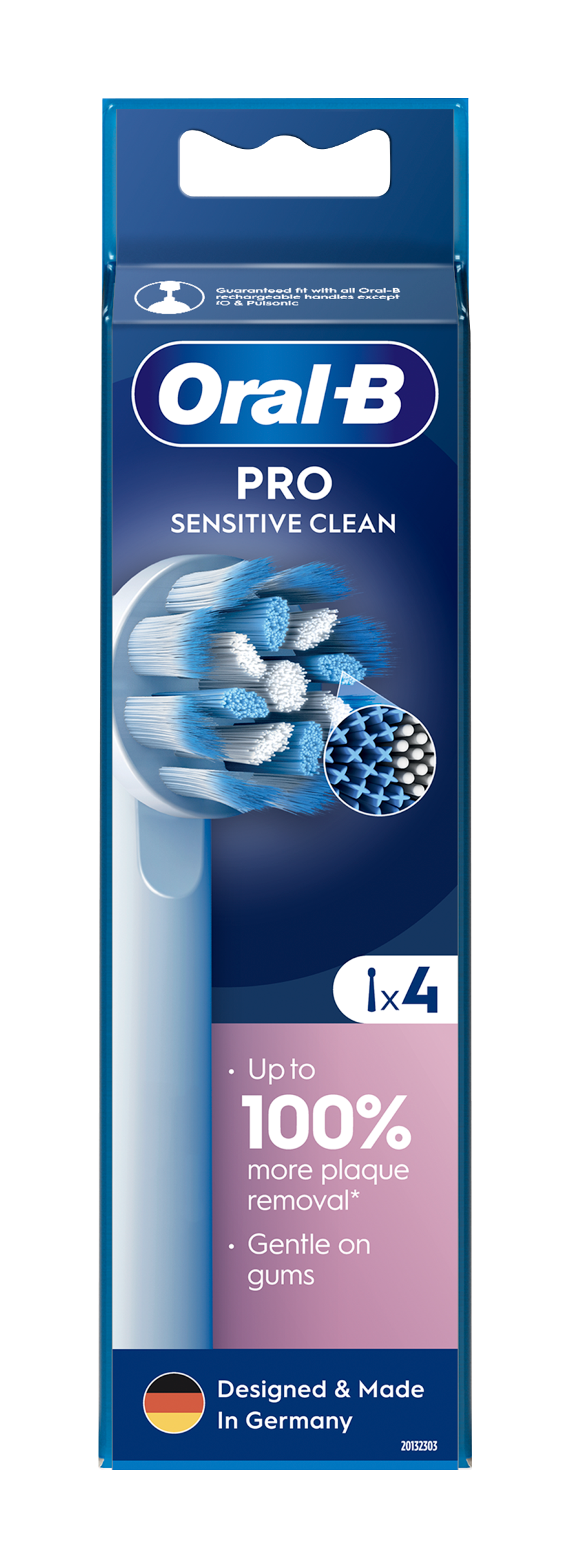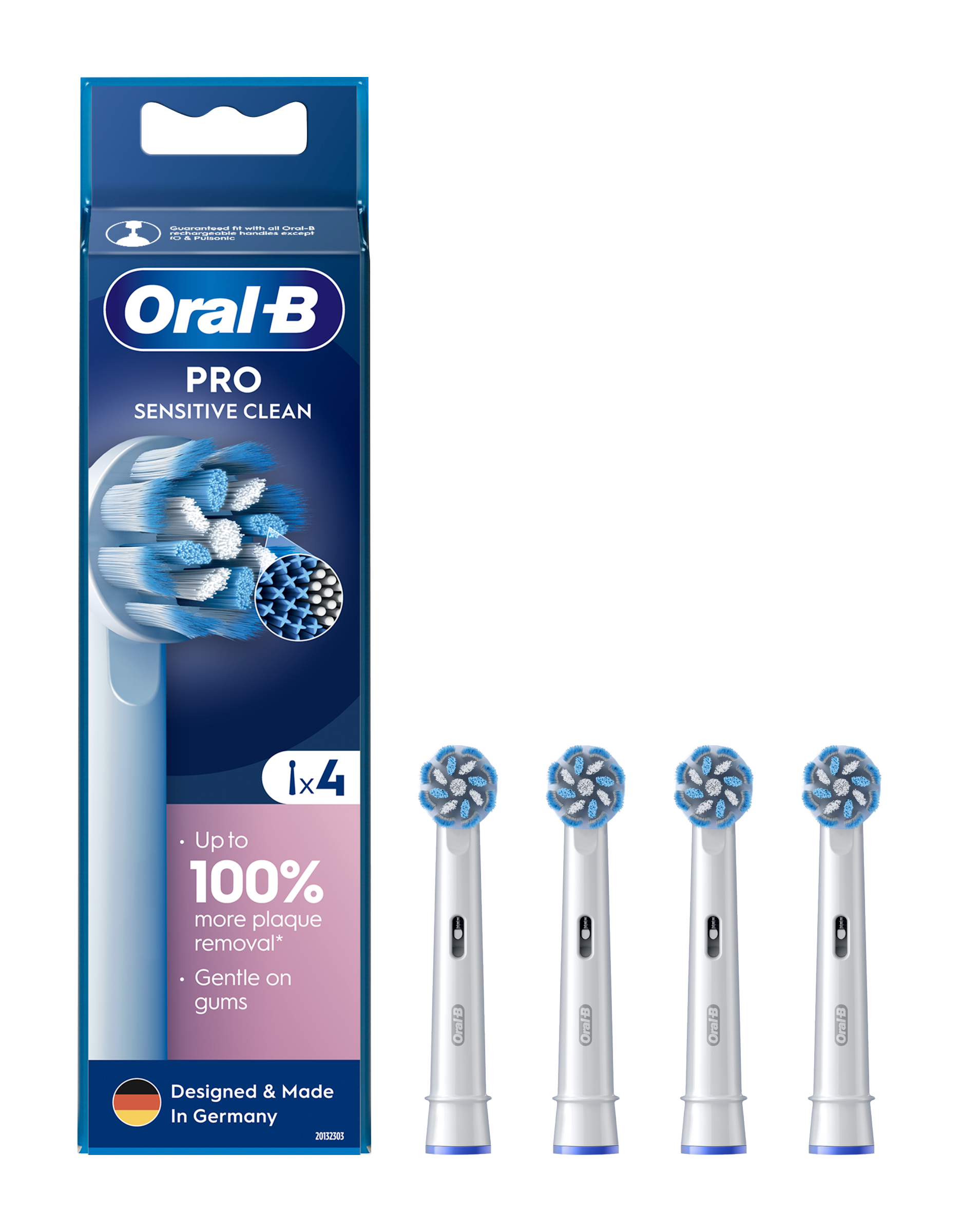 Kartáčková hlava Oral-B Sensitive Clean obsahuje kombinaci extra měkkých vláken, která jsou šetrná k dásním, a běžných vláken, která jsou nekompromisní k zubnímu plaku. V porovnání s běžným manuálním zubním kartáčkem odstraňuje až o 100 % více zubního plaku a o 100 % snižuje zánět dásní. Originální kartáčkové hlavy Oral-B jsou navrženy s novými vlákny ve tvaru X, která čistí v místech, kam kulaté hlavy nedosáhnou. Ukazatel opotřebení kartáčkové hlavy změní vlákna ze zelené barvy na žlutou a ukazuje tak, kdy je hlavu nutné vyměnit pro 100% účinnost čištění. Zaručená kompatibilita se všemi dobíjecími zubními kartáčky Oral-B, s výjimkou zubních kartáčků Pulsonic a iO.