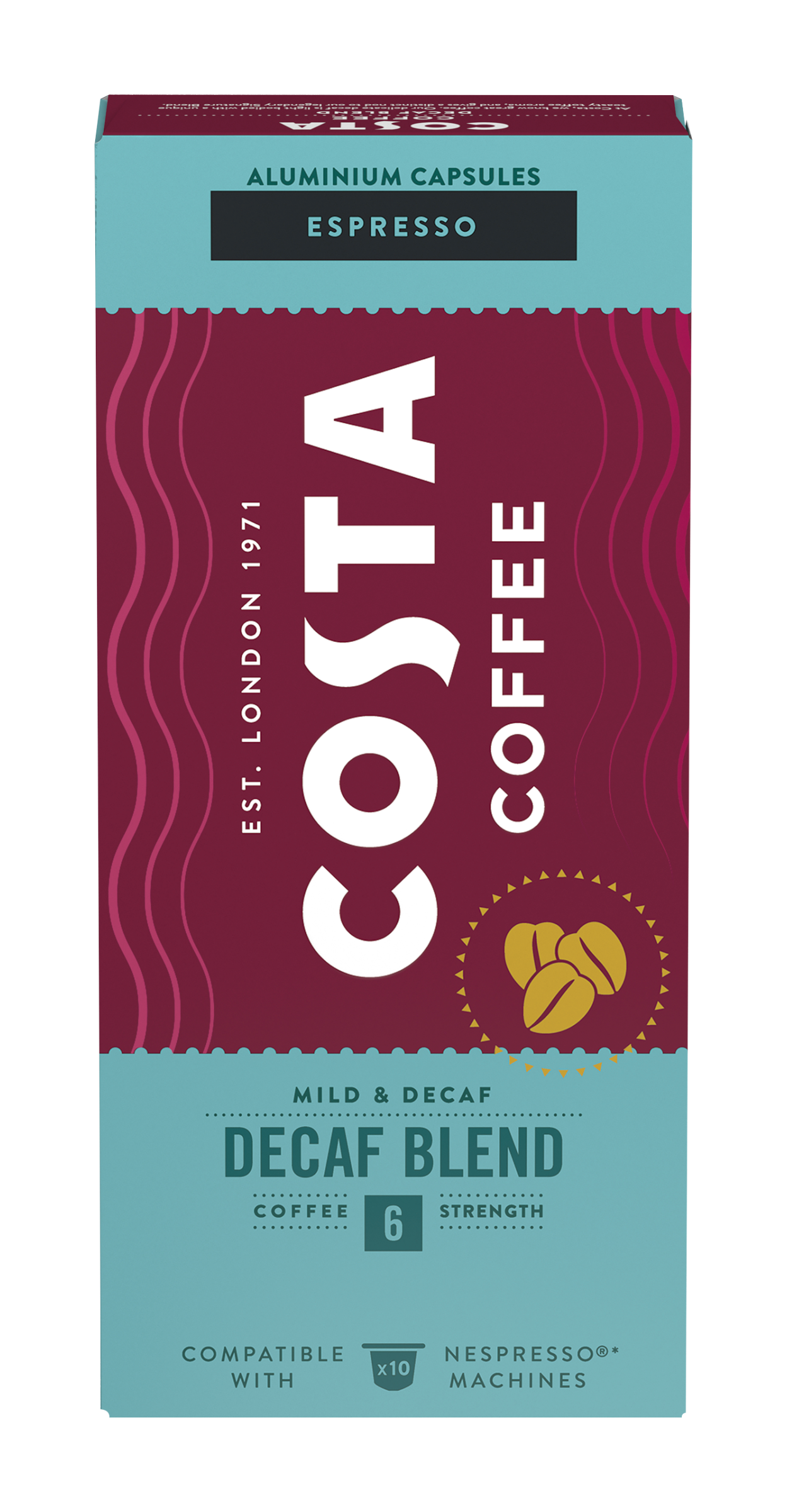 Signature Decaf Blend Espresso Costa Coffee je harmonicky složená směs zrn arabiky a robusty, má intenzitu 6 z 12, prostě ideální pro každodenní pití kávy.