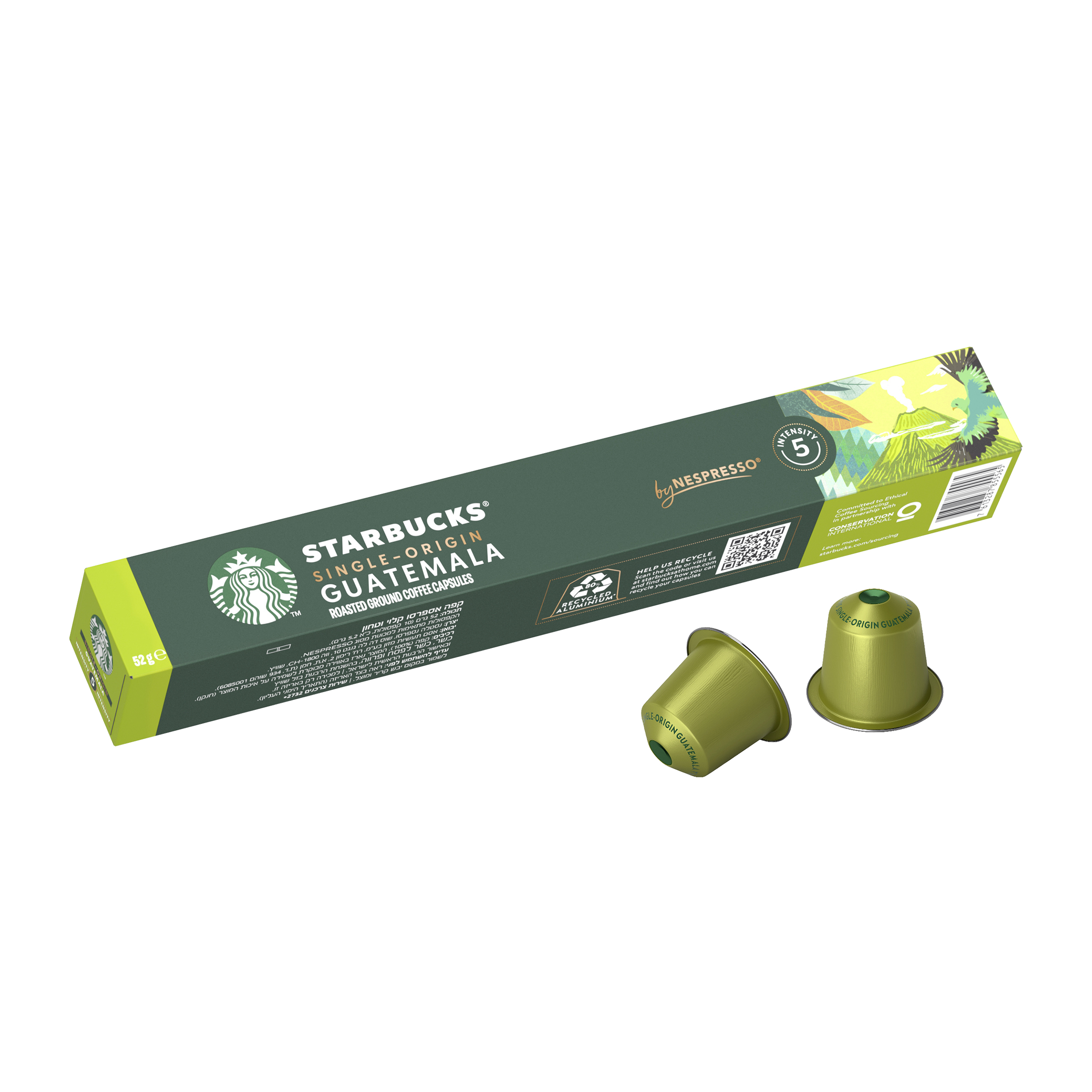 Starbucks® by Nespresso® Single-Origin Guatemala, káva pocházející z Guatemaly, se vyznačuje vyváženou chutí, která vyzdvihuje svěží tóny kandovaného citrónu a sladkého karamelu. Káva je světle pražená a potěší milovníky jemné kávy.