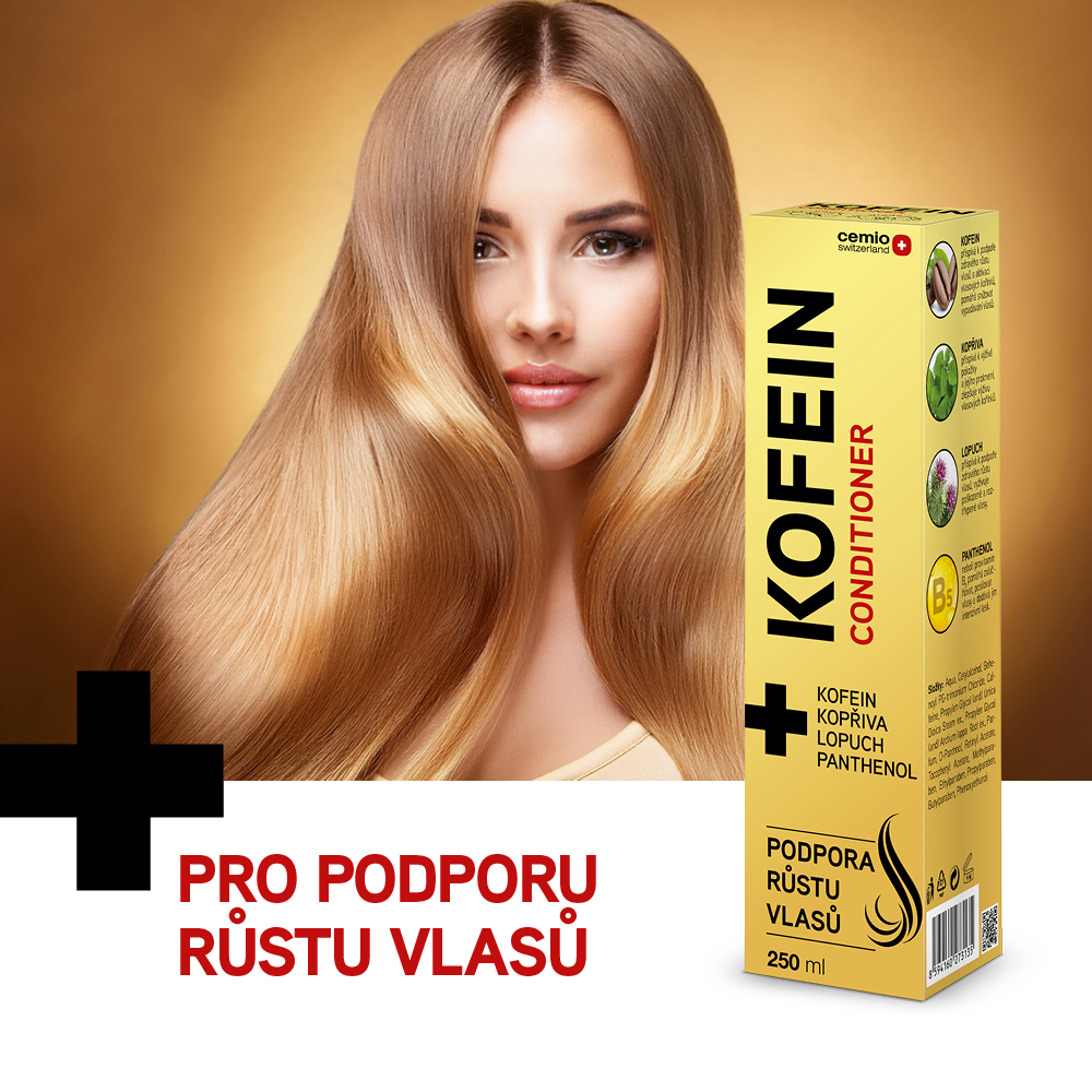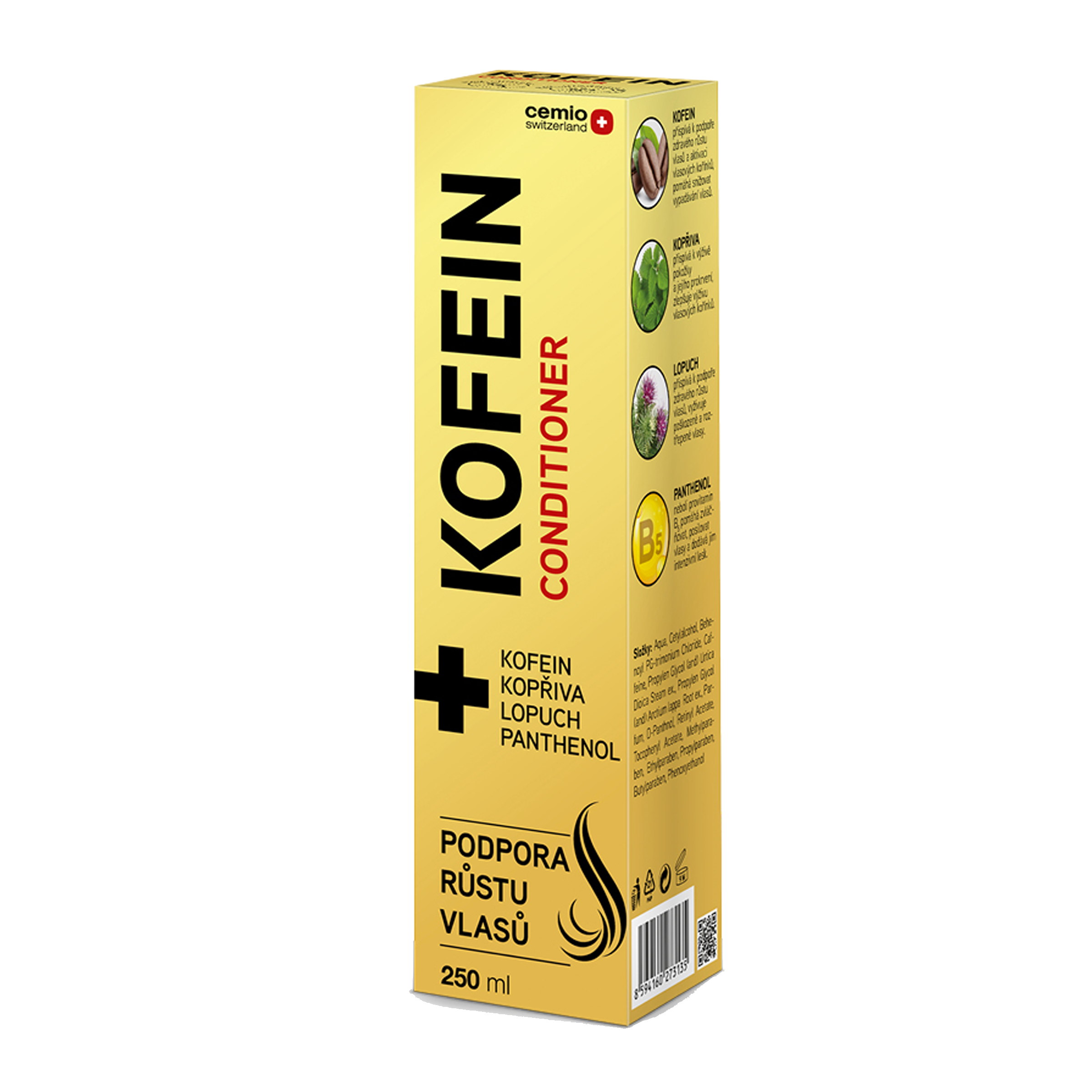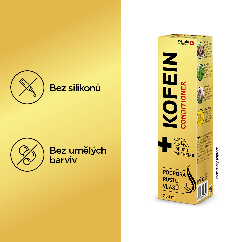 Cemio Kofein conditioner s kofeinem, kopřivou, lopuchem a panthenolem doplňuje péči o vlasy při jejich nadměrném vypadávání. Vyživuje a regeneruje vlasová vlákna, zanechává vlasy hladké, lesklé a snadno rozčesatelné. Aktivní látky posilují vlasy, chrání je před vysušením i poškozením a podporují jejich zdravý růst.