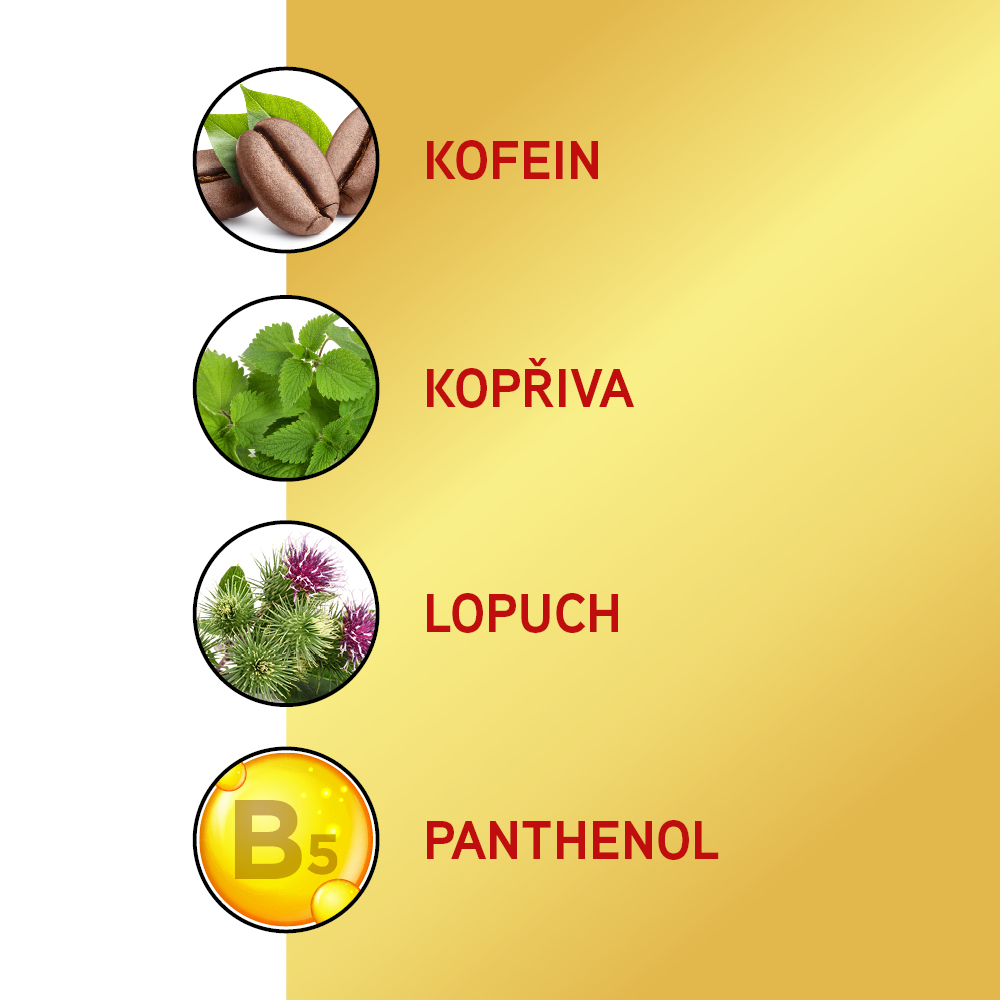 Kofein podporuje růst vlasů, posiluje je a pomáhá omezit jejich padání. Dodává vlasům vitalitu a energii.