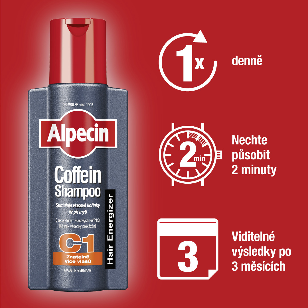 Víc pohodlné už to být nemůže - mytím vlasů proti jejich vypadávání. Posiluje oslabené vlasové kořínky. Předchází dědičnému vypadávání vlasů. Při každodenním mytí vlasů šamponem C1 jsou vlasové kořínky okamžitě zásobeny aktivními látkami. Alpecin Coffein je ve vlasovém kořínku velmi dobře prokazatelný již za 120 sec.