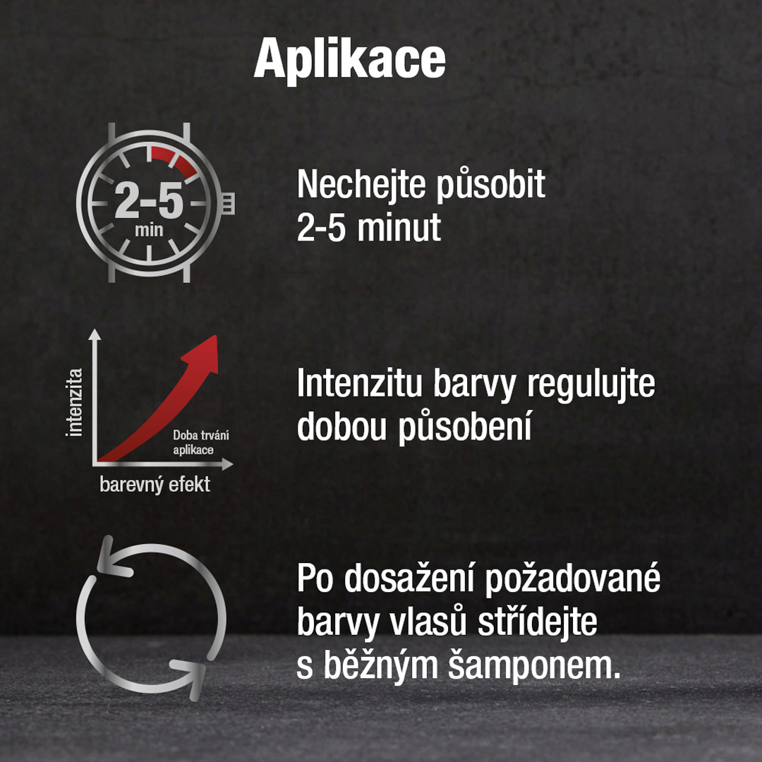 Použití: Nechte denně působit 2 minuty (od aplikace po opláchnutí). Necháte-li Grey Attack působit déle, zvýšíte účinek barvení. Jakmile dosáhnete požadované barvy vlasů, používejte Grey Attack střídavě s běžným šamponem pro udržení barevného tónu. Použití: - Šampon Grey Attack Coffein & Color místo běžného šamponu. - Doba aplikace 2-5 minut. - Vhodné pro jakoukoli barvu vlasů. Nejlépe pro světle hnědé až černé vlasy. - Abyste zabránili vzniku barevných skvrn, důkladně opláchněte zbytky šamponu z povrchů a textilií.
