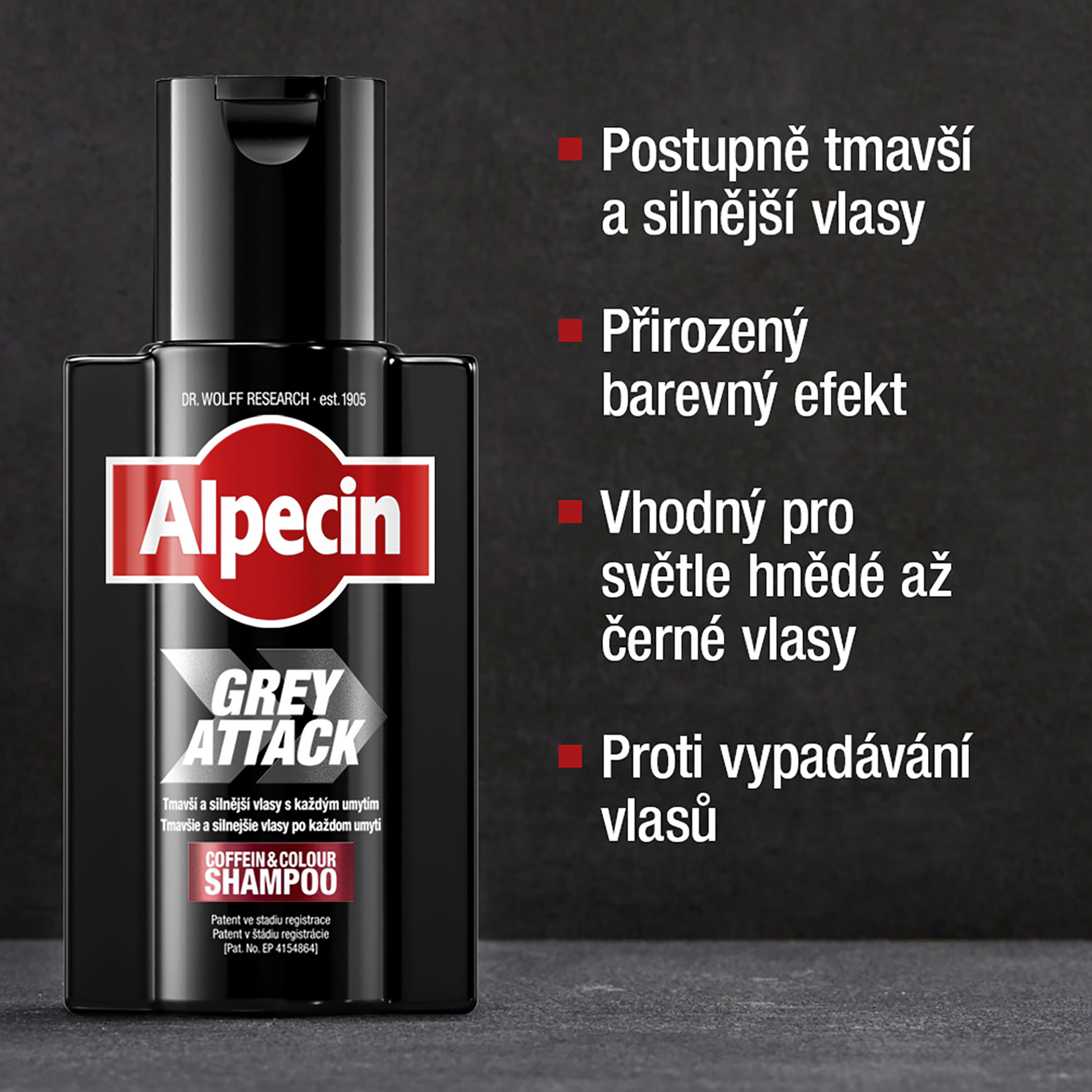 Podle výzkumu Dr. Wolffa: Černý kofeinový šampon s účinkem repigmentace 5,6-DHI. Pro přirozenou barvu vlasů a trvalý efekt pigmentace. Tmavší a silnější vlasy s každým mytím Jednoduché použití jako běžný šampon. Regulovatelná intenzita barvy pomocí doby a četnosti použití. Přirozený vzhled vlasů. Vhodné pro jakoukoli barvu vlasů - nejlépe pro světle hnědé až černé vlasy. Silnější vlasy díky kofeinu.