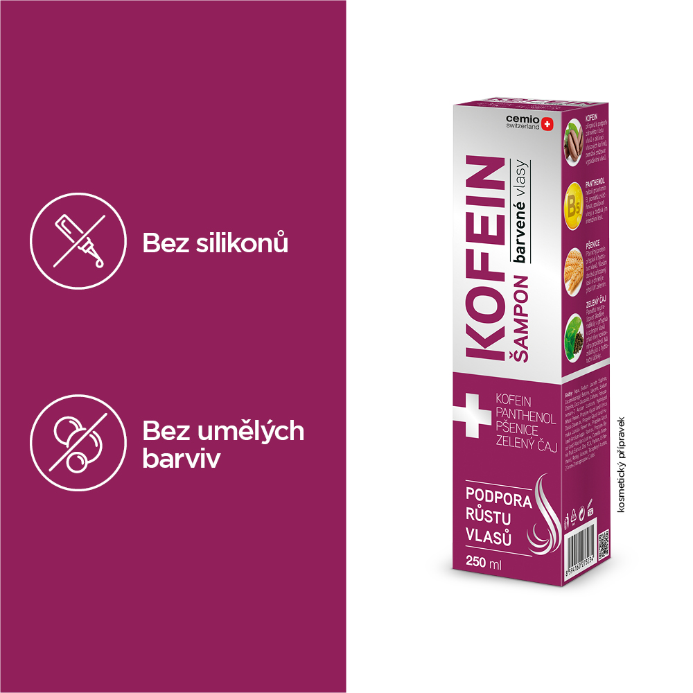 Cemio KOFEIN šampon na barvené vlasy, 250 ml s kofeinem, panthenolem, pšenicí a zeleným čajem přispívá k hydrataci vlasů. Vlasům dodává přirozený lesk a chrání je před UV zářením. Šampon speciálně pro péči o barvené vlasy. Hydratované a silné vlasy. Účinné látky kofein, panthenol, pšenice a zelený čaj. Vhodný na denní použití.
