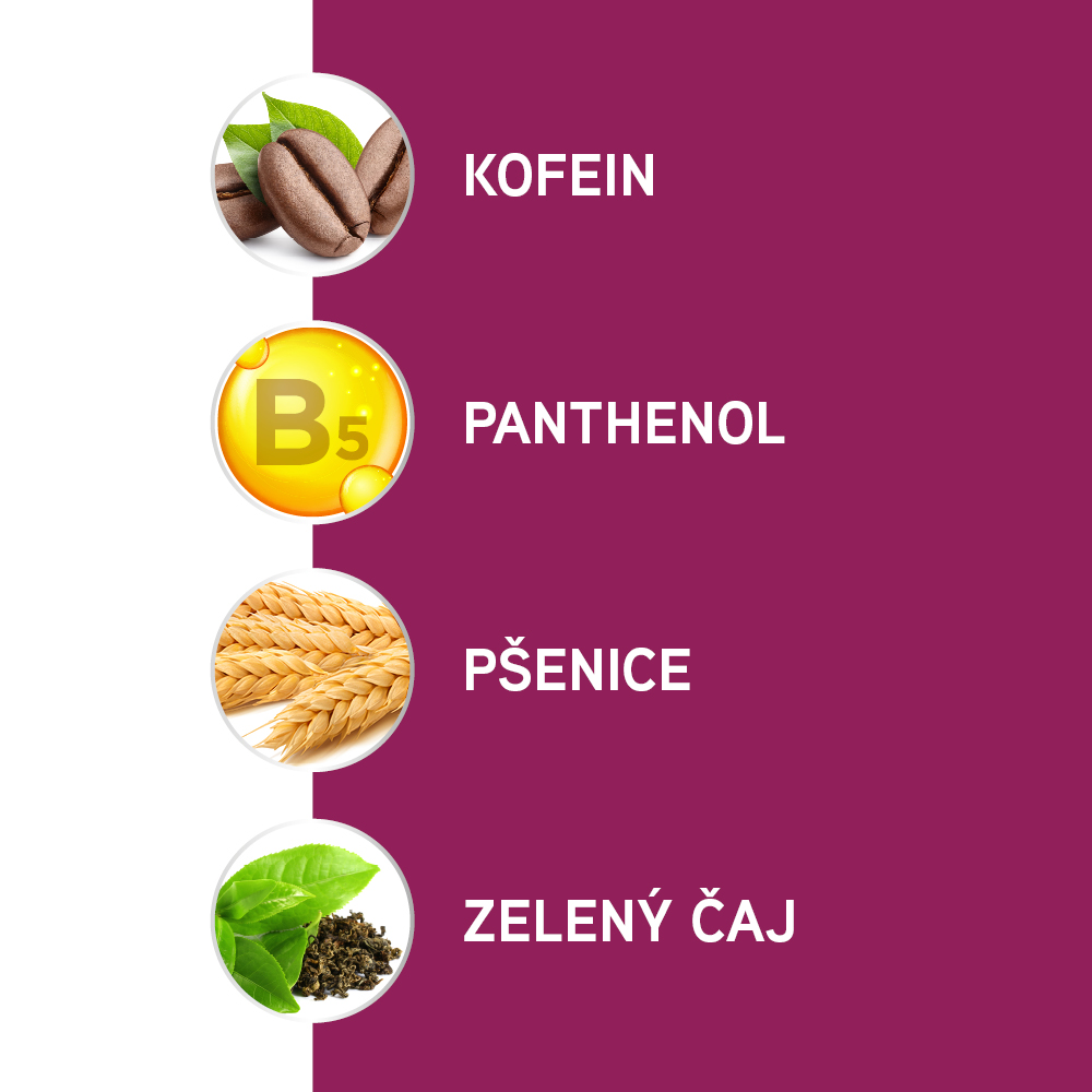 Aqua, Sodium Laureth Sulphate, Cocamidopropyl Betaine, Glycerin, Sodium Chloride, Coco-Glucoside, Caffeine, Polyqua-ternium-7, Acidum Lacticum, Hydrolyzed Wheat Protein, Propylen Glycol (and) Urtica Dioica Steam ex., Propylen Glycol (and) Hu-mulus Lupulus Flower ex., Propylen Glycol (and) Arctium lappa Root ex., Propylen Gly-col (and) Aloe Vera Leaf ex., Camellia Sinen-sis Fruit Extract, Zinc PCA, Parfum, D-Pan-thenol, Retinyl Acetate, Tocopheryl Acetate, 2-brom-2-nitropropane 1,3 diol.