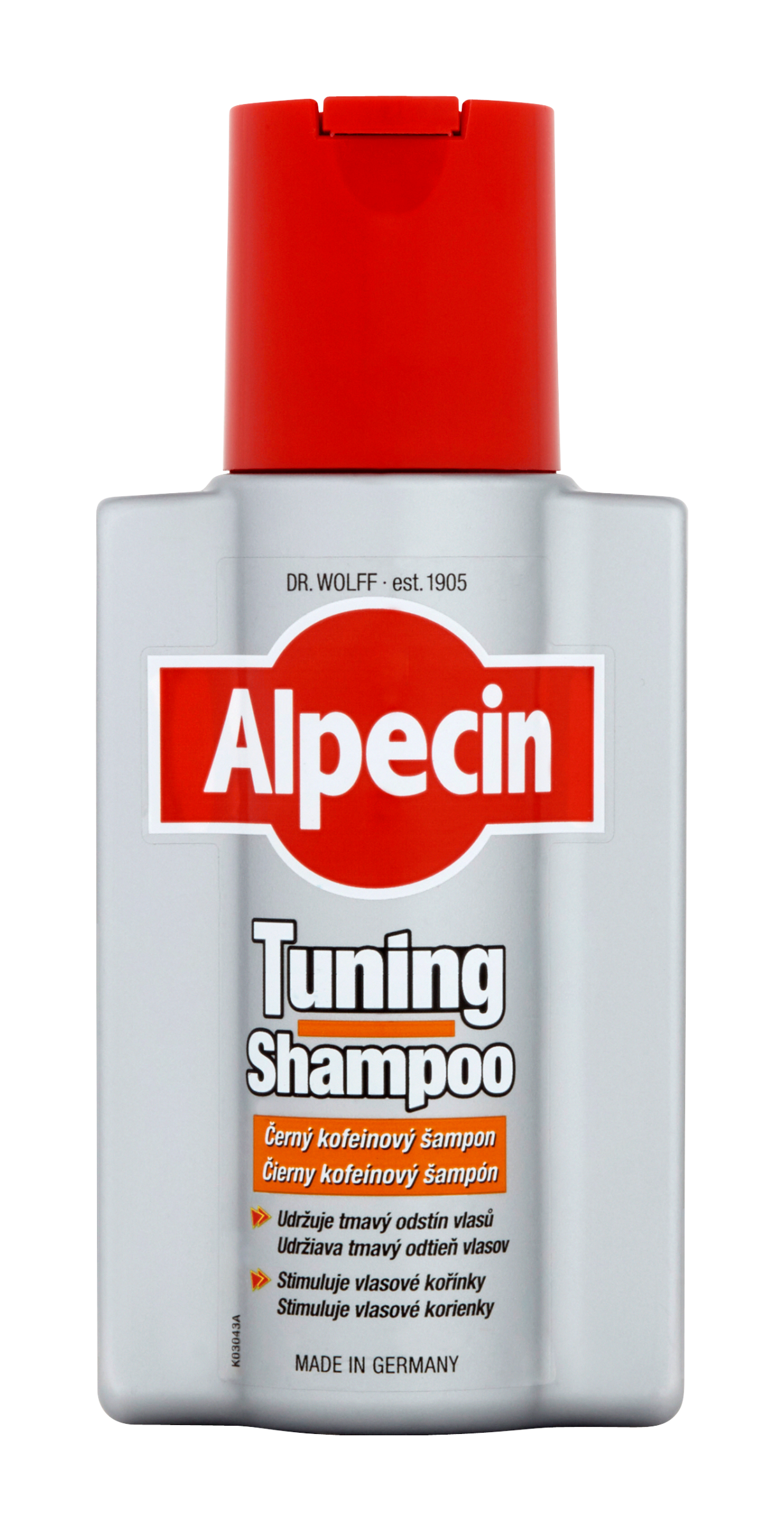 Tuning vlasů při každém mytí Alpecin Tuning Shampoo - černý kofeinový šampon, který udržuje tmavý odstín vlasů a stimuluje růst vlasů přímo u kořínků. Vyvinutý a vyrobený v Německu. Barvící účinek: Při každém mytí vlasů se tmavé pigmenty vážou na povrch vlasu. Efekt se postupně zvýrazňuje s každým mytím vlasů. Účinek na růst vlasů: Kofein proniká během mytí vlasů do vlasových kořínků a chrání je proti dědičnému vypadávání vlasů.