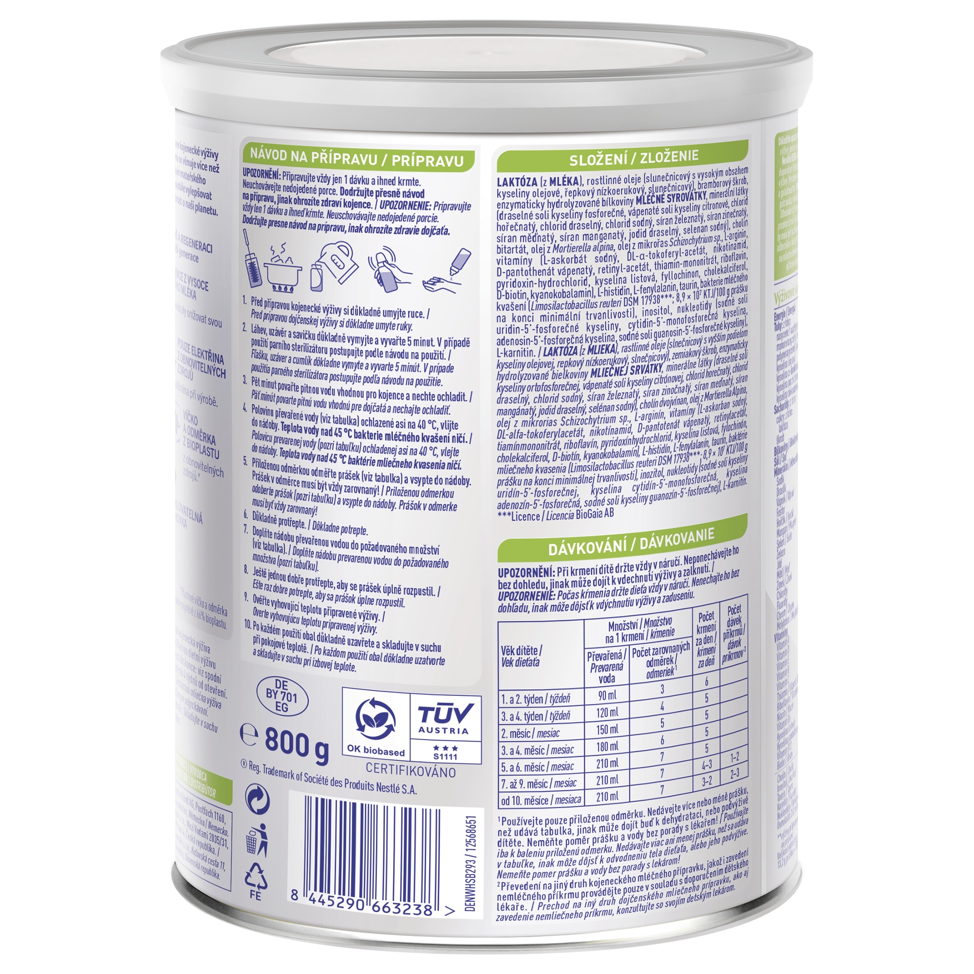 LAKTÓZA (z MLÉKA), rostlinné oleje (slunečnicový s vysokým obsahem kyseliny olejové, řepkový nízkoerukový, slunečnicový), enzymaticky hydrolyzovaný bílkovinný koncentrát MLÉČNÉ SYROVÁTKY, minerální látky (glycerofosforečnan vápenatý, vápenaté soli kyseliny fosforečné, chlorid draselný, chlorid vápenatý, chlorid hořečnatý, chlorid sodný, síran železnatý, síran zinečnatý, síran měďnatý, síran manganatý, jodid draselný, selenan sodný), RYBÍ olej, olej z Mortierella alpina, L-arginin, vitamíny (L-askorbát sodný, D-pantothenát vápenatý, DL- alfa-tokoferyl-acetát, nikotinamid, riboflavin, thiamin-mononitrát, retinyl-acetát, pyridoxin-hydrochlorid, kyselina listová, fyllochinon, D-biotin, cholekalciferol, kyanokobalamin), L-histidin, L-thyrosin, bakterie mléčného kvašení (Limosilactobacillus reuteri DSM 17938; 8,9 x 107 KTJ / 100 g prášku na konci minimální trvanlivosti).