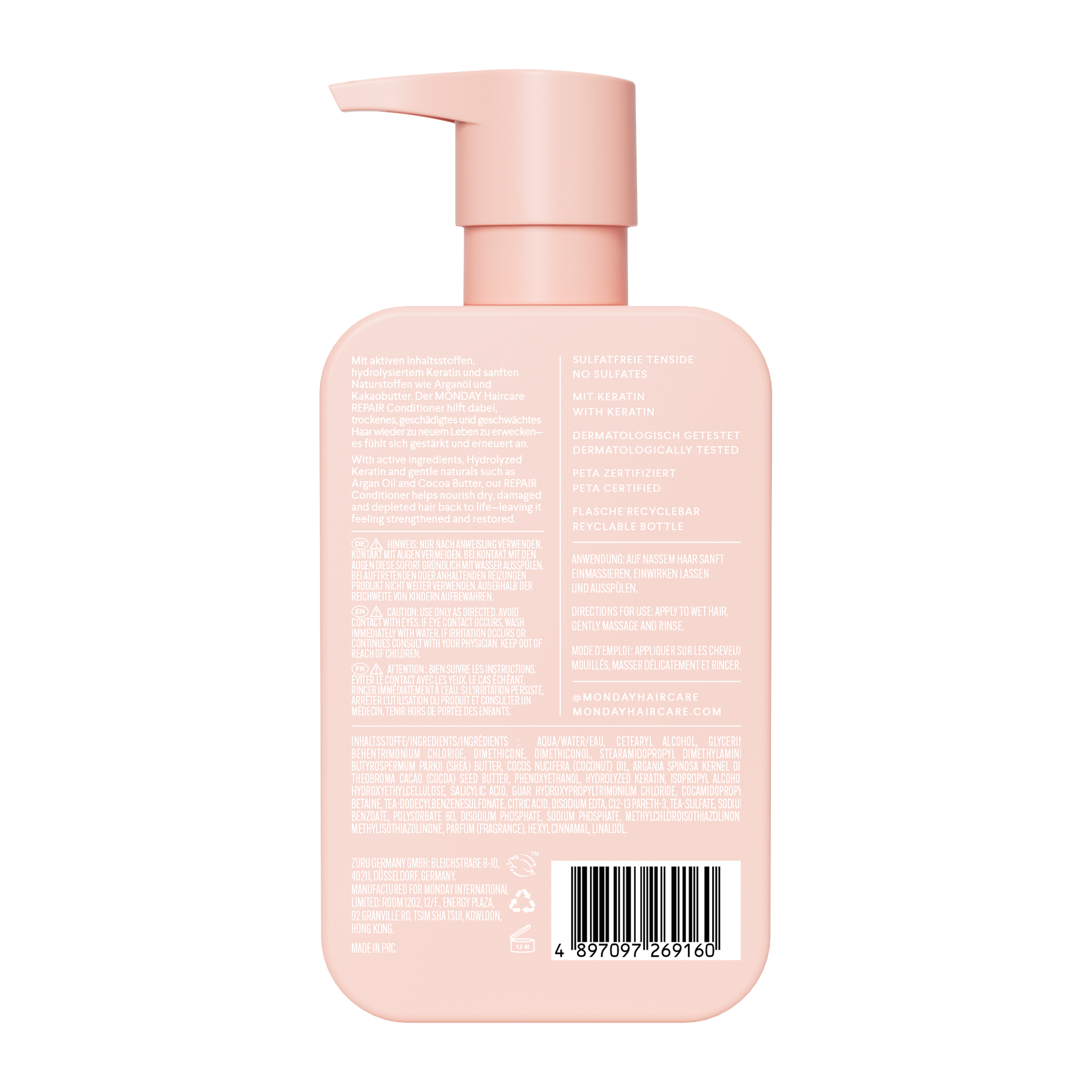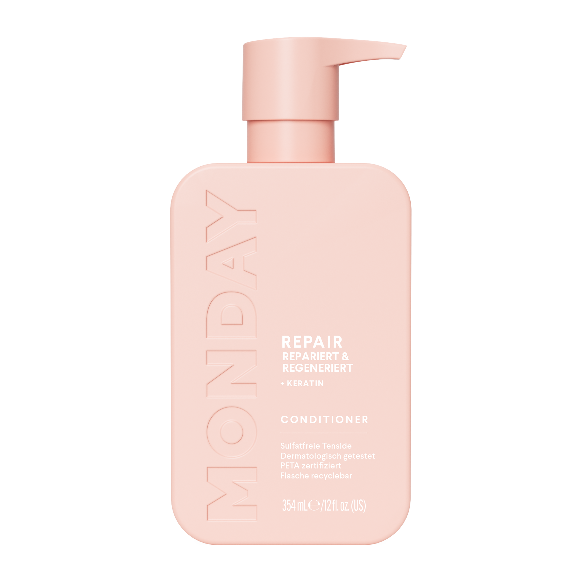 Kondicionér MONDAY Repair s aktivními složkami, hydrolyzovaným keratinem a jemnými přírodními látkami, jako je arganový olej a kakaové máslo. Pomáhá revitalizovat suché, poškozené a oslabené vlasy. Vlasy jsou posílené a obnovené.