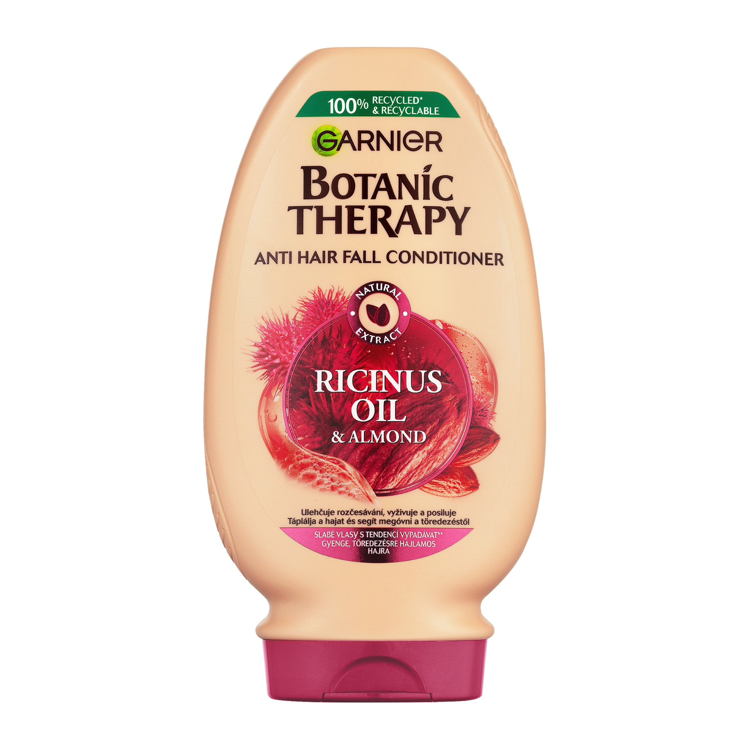 Spojení ricinového a mandlového oleje v revitalizující posilující receptuře pro ulehčení rozčesávání, posílení a zpevnění vlasů od kořínků po konečky.
