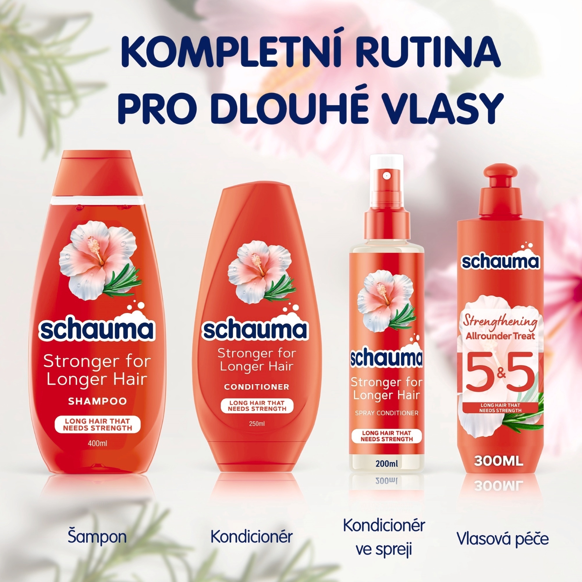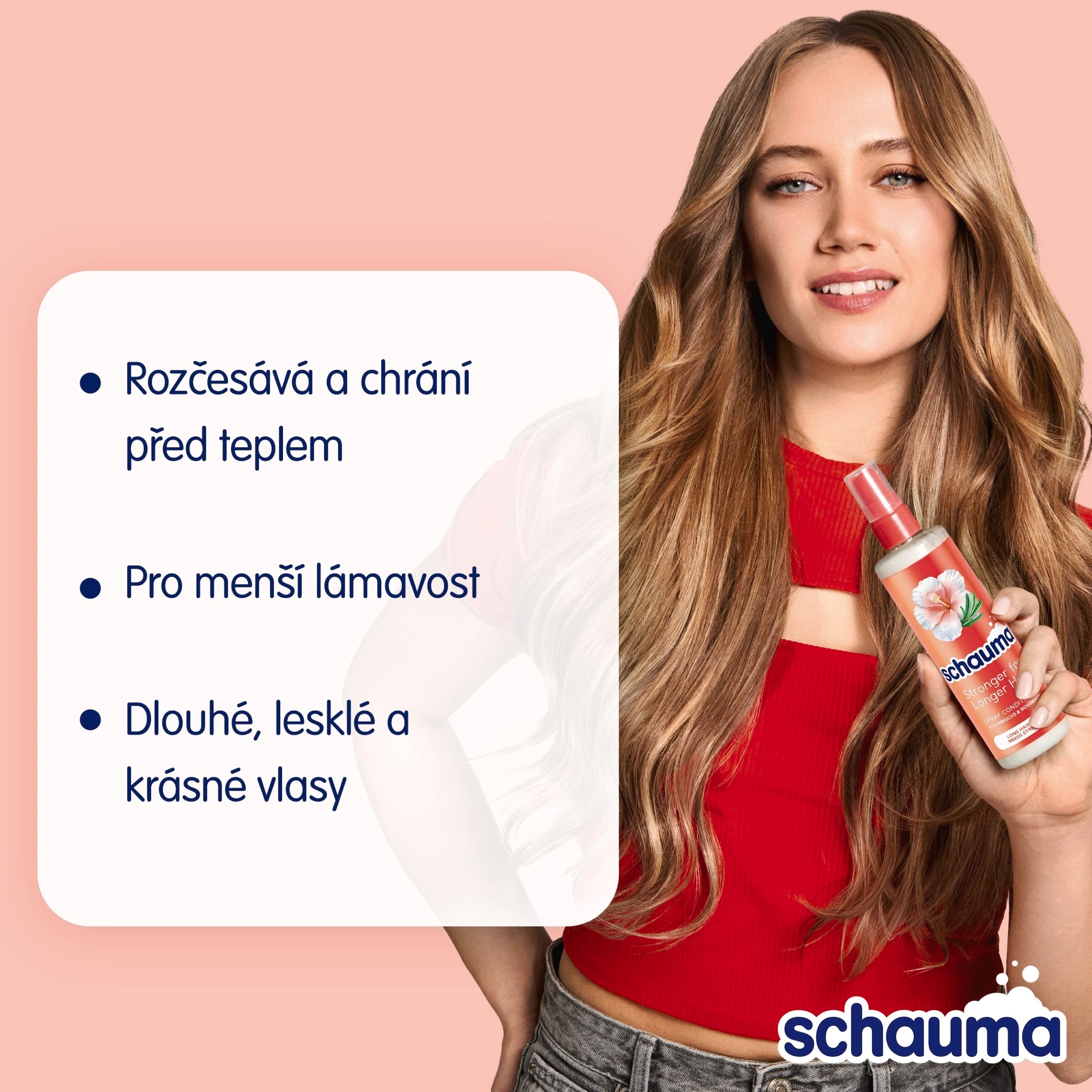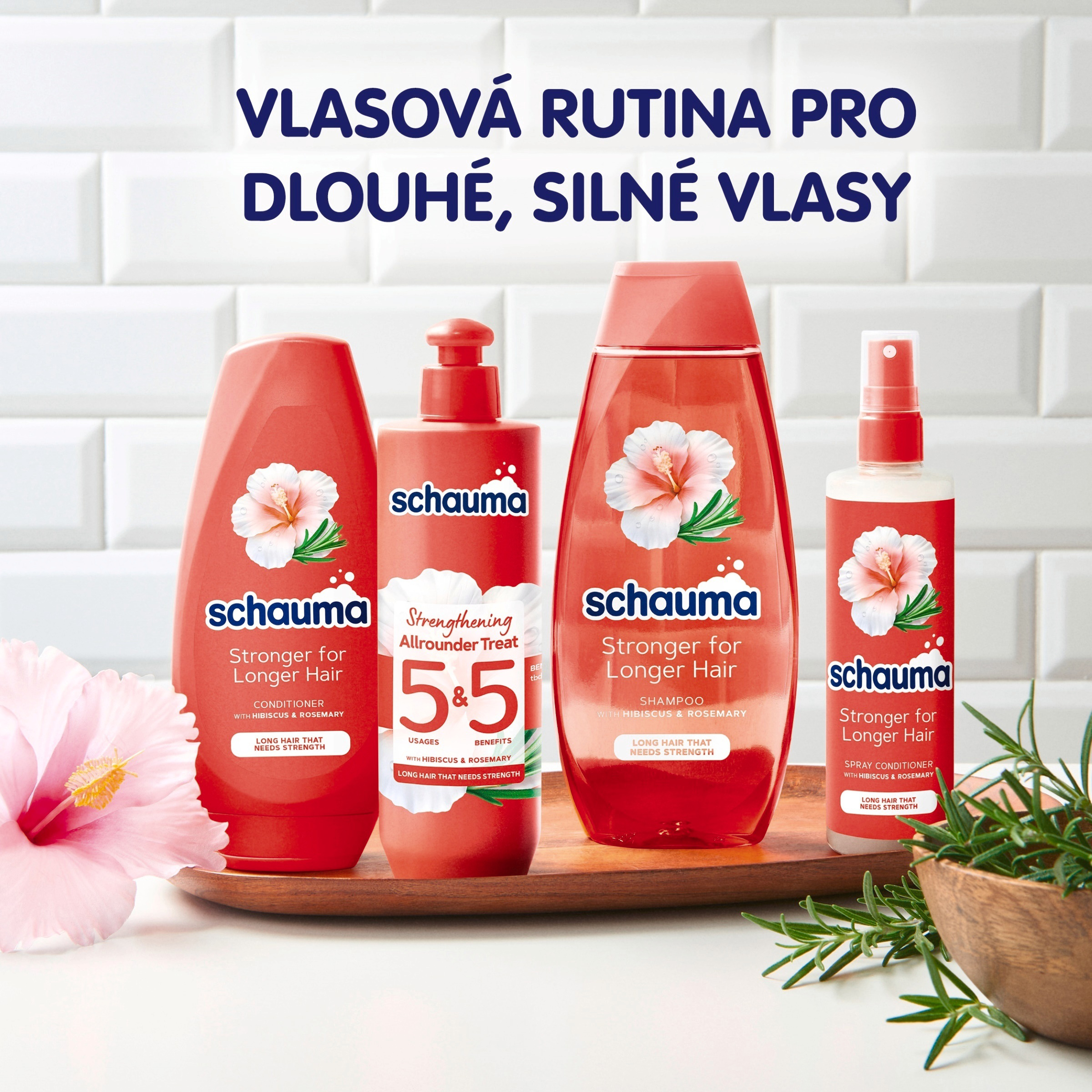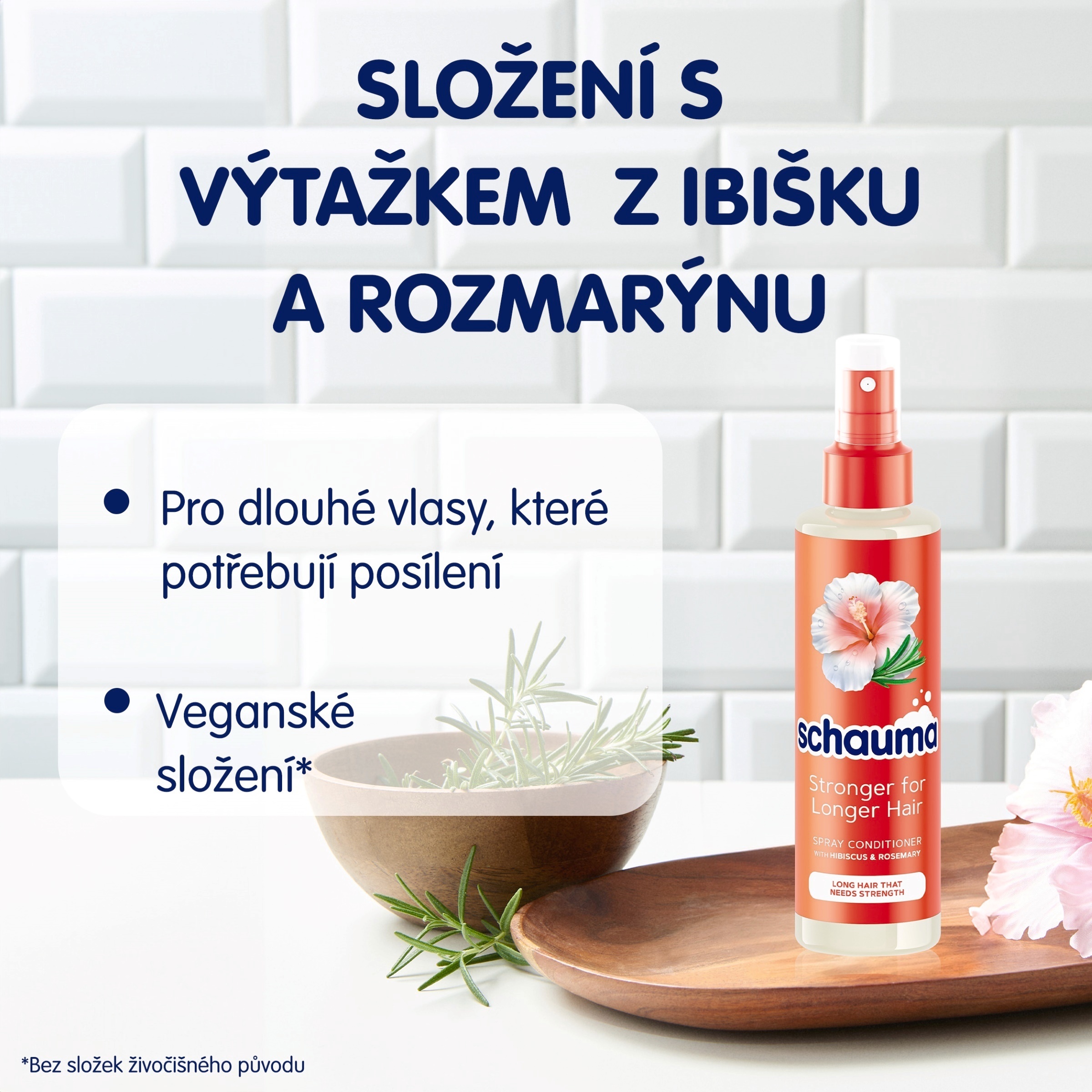 Bezoplachový kondicionér ve spreji Schauma Stronger for Longer Hair s ibiškem a rozmarýnem pro dlouhé vlasy, které potřebují posílení. Tento Schauma kondicionér ve spreji pro dlouhé vlasy usnadňuje jejich rozčesávání, chrání je před teplem až do 230 °C a zároveň jim dodává sílu pro menší lámavost. Složení je veganské (bez přísad živočišného původu) a obsahuje výtažek s ibišku a rozmarýnu.