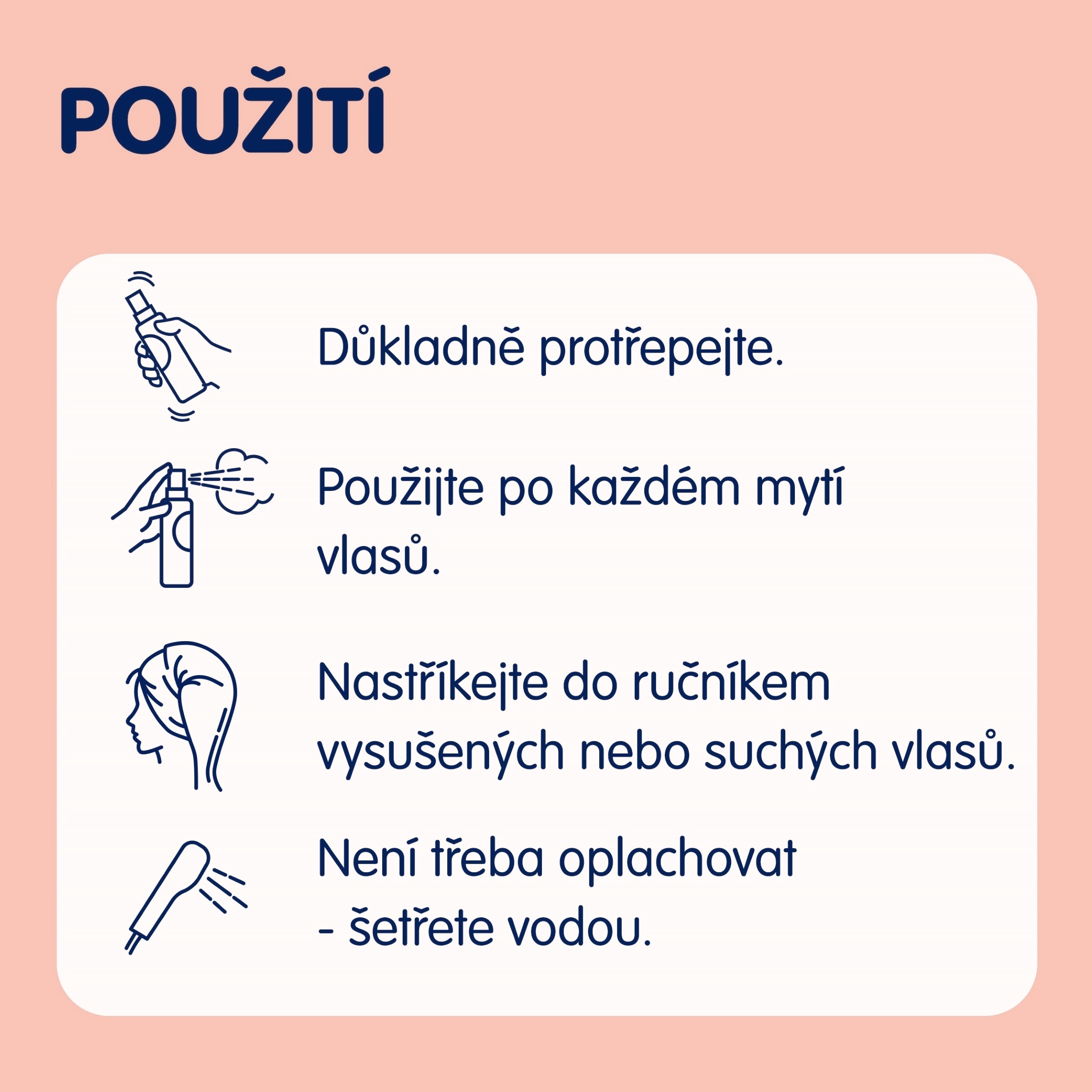 Kondicionér dobře protřepejte a nastříkejte ho po každém umytí do ručníkem vysušených nebo suchých vlasů. Není potřeba oplachovat. Odstraňte z podlahy všechny zbytky produktu.